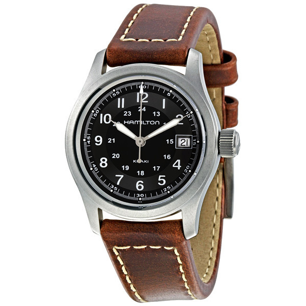Silver-tone stainless steel case with a brown leather strap. Fixed silver-tone stainless steel bezel. Black dial with luminous silver-tone hands and Arabic numeral hour markers. 24 hour (GMT) markers. minute markers around the outer rim. Dial Type: Analog. Luminescent hands and dial markers. Date display at the 3 o'clock position. ETA Caliber F05.111 quartz movement. Scratch resistant sapphire crystal. Steel crown. Solid case back. Round case shape, case size: 33 mm, case thickness: 10 mm. Band width: 18 mm. Tang clasp. Water resistant at 50 meters / 165 feet. Functions: GMT, date, hour, minute, second. Additional Info: withstands rain and splashes of water, but not showering or submersion. Sport watch style. Hamilton Khaki Field Black Dial Brown Leather Mens Watch H68311533.