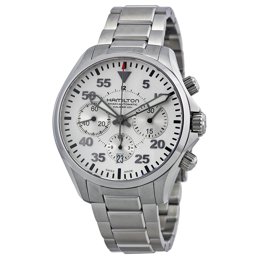 Stainless steel case with a stainless steel bracelet. Fixed stainless steel bezel. Silver dial with luminous hands and index hour markers. Arabic numeral minute markers (at 5 minute intervals). Minute markers around the outer rim. Dial Type: Analog. Luminescent hands and markers. Date display above the 6 o'clock position. Chronograph - three sub-dials displaying: 60 second, 30 minute and 12 hour. Hamilton calibre H-31 automatic movement, based upon ETA 7753, containing 27 Jewels, bitting at 28800 vph, and has a power reserve of approximately 60 hours. Scratch resistant sapphire crystal. Screw down crown. Transparent case back. Round case shape. Case size: 42 mm. Case thickness: 15 mm. Band width: 20 mm. Band length: 8.5 inches. Deployment clasp. Water resistant at 200 meters / 660 feet. Functions: chronograph, date, hour, minute, second. Khaki Pilot Series. Pilot watch style. Watch label: Swiss Made. Hamilton Khaki Pilot Automatic Chronograph Mens Watch H64666155.