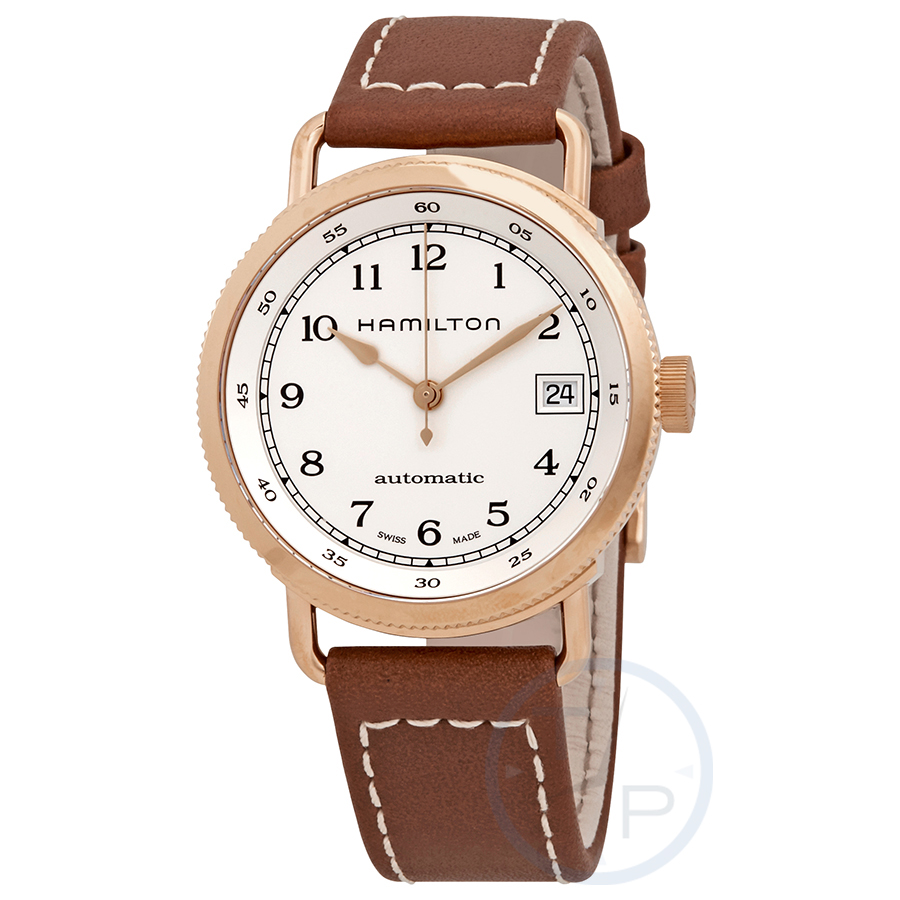 Rose gold PVD stainless steel case with a brown leather strap. Fixed rose gold PVD stainless steel bezel. Silver dial with rose gold-tone spade-shaped hands and Arabic numeral hour markers. Minute markers around the outer rim. Dial Type: Analog. Date display at the 3 o'clock position. Hamilton Calibre H-10 Automatic movement, based upon ETA C07.111, containing 25 Jewels, bitting at 21600 vph, and has a power reserve of approximately 80 hours. Scratch resistant sapphire crystal. Transparent case back. Round case shape, case size: 36 mm, case thickness: 11 mm. Band width: 18 mm. Tang clasp. Water resistant at 100 meters / 330 feet. Functions: date, hour, minute, second. Casual watch style. Watch label: Swiss Made. Hamilton Navy Pioneer Automatic Silver Dial Ladies Watch H78205553.