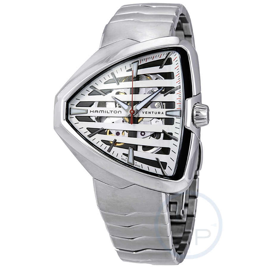 Stainless steel case with a stainless steel bracelet. Fixed stainless steel bezel. Silver (cut-out) dial with luminous silver-tone dauphine-style hands and index hour markers. Minute markers around the outer rim. Dial Type: Analog. Luminescent hands. Hamilton calibre H-10-S automatic movement, based upon ETA C07.111, containing 25 Jewels, bitting at 21600 vph, and has a power reserve of approximately 80 hours. Scratch resistant sapphire crystal. Pull / push crown. Transparent case back. Shield case shape. Case size: 42.5 mm x 44.6 mm. Case thickness: 11.38 mm. Band width: 22 mm. Butterfly clasp with a push button release. Water resistant at 50 meters / 165 feet. Functions: hour, minute, second. Ventura Elvis80 Series. Dress watch style. Watch label: Swiss Made. Hamilton Ventura Elvis80 Automatic Skeleton Shield Shaped Mens Watch H24555181.