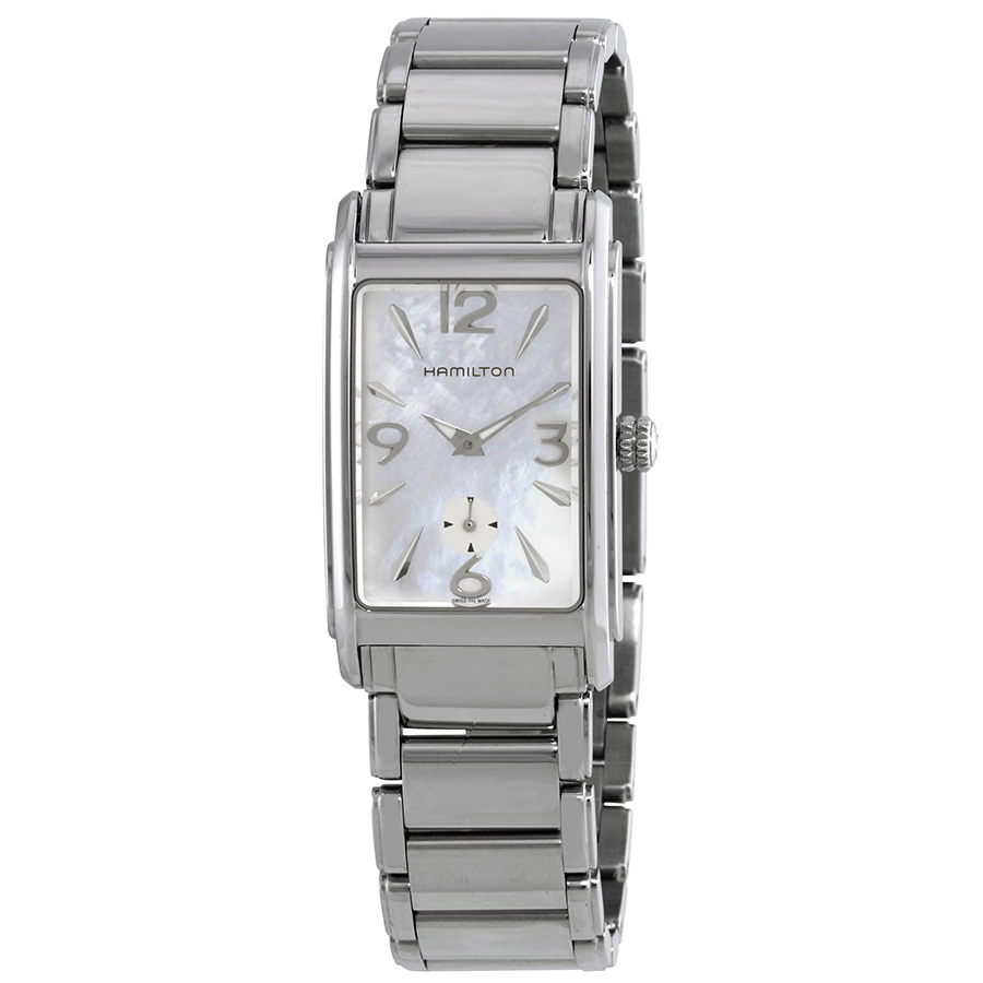 Stainless steel case with a stainless steel bracelet. Fixed stainless steel bezel. Mother of pearl dial with silver-tone hands and index hour markers. Arabic numerals mark the 3, 6, 9 and 12 o'clock positions. Dial Type: Analog. Small seconds sub-dial. Quartz movement. Scratch resistant sapphire crystal. Pull / push crown. Solid case back. Rectangle case shape. Case size: 24 mm. Case thickness: 7 mm. Band width: 18 mm. Band length: 7.5 inches. Water resistant at 30 meters / 100 feet. Functions: hour, minute, second. Luxury watch style. Watch label: Swiss Made. Hamilton Ardmore Ladies Watch H11411155.