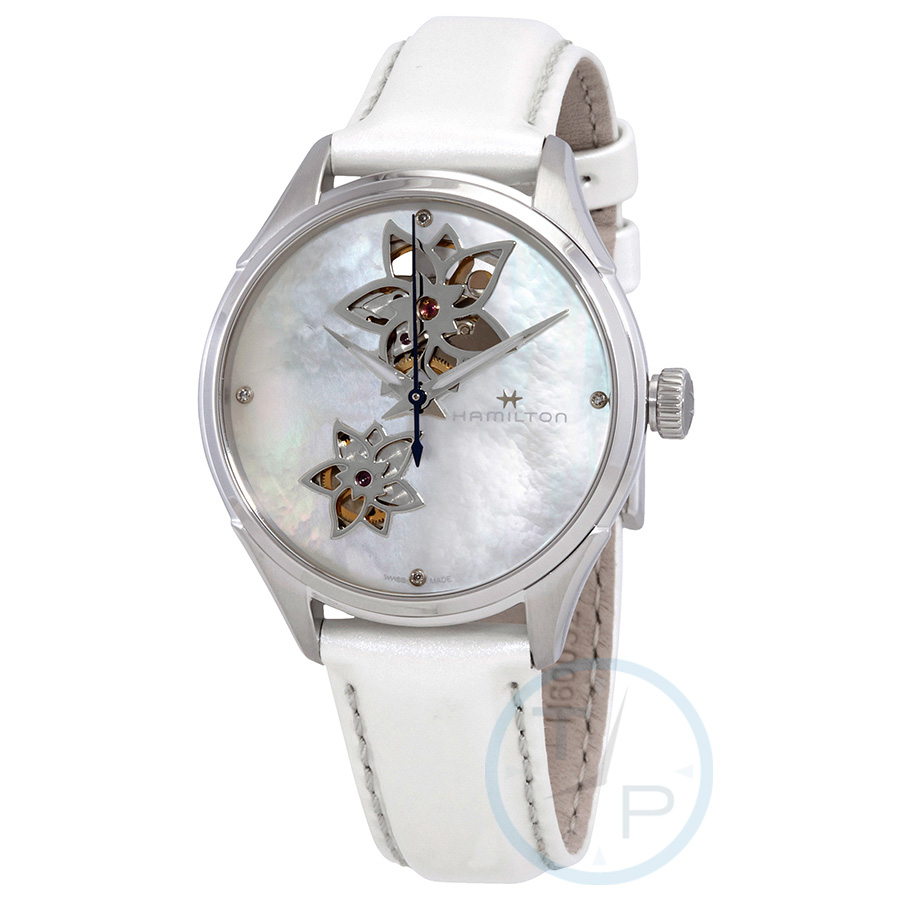 Stainless steel case with a white leather strap. Fixed stainless steel bezel. Mother of pearl (open heart) dial with luminous silver-tone dauphine-style shape hands. Diamonds mark the 3, 6, 9 and 12 o'clock positions. Dial Type: Analog. Luminescent hands. Hamilton calibre H-10 automatic movement, based upon ETA C07.111, containing 25 Jewels, bitting at 21600 vph, and has a power reserve of approximately 80 hours. Scratch resistant sapphire crystal. Pull / push crown. Transparent case back. Round case shape. Case size: 34 mm. Case thickness: 10.64 mm. Band width: 16 mm. Tang clasp. Water resistant at 50 meters / 165 feet. Functions: hour, minute, second. Casual watch style. Watch label: Swiss Made. Hamilton Jazzmaster Open Heart Mother of Pearl Dial Ladies Watch H32115892.