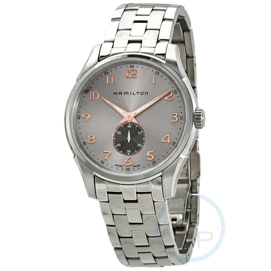Silver-tone stainless steel case with a silver-tone stainless steel bracelet. Fixed silver-tone stainless steel bezel. Grey dial with luminous rose gold-tone dauphine-style shape hands and Arabic numeral hour markers. Minute markers around the outer rim. Dial Type: Analog. Luminescent hands. One subdial displaying: small second. ETA Caliber 980.163 quartz movement. Scratch resistant sapphire crystal. Pull / push crown. Solid case back. Round case shape, case size: 40 mm, case thickness: 7.35 mm. Band width: 20 mm. Fold over clasp. Water resistant at 50 meters / 165 feet. Functions: hour, minute, small second. Jazzmaster Thinline Series. Casual watch style. Watch label: Swiss Made. Hamilton Jazzmaster Thinline Quartz Grey Dial Mens Watch H38411180.