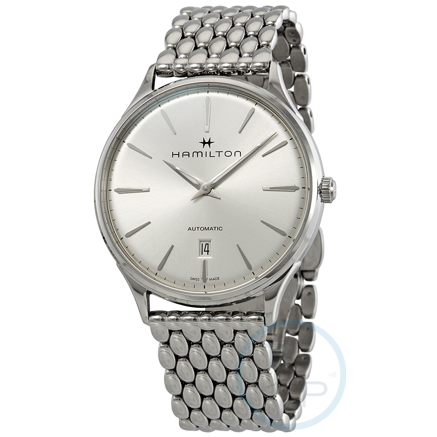 Silver-tone stainless steel case with a silver-tone stainless steel bracelet. Fixed silver-tone stainless steel bezel. Light tan dial with silver-tone dauphine-style shape hands and index hour markers. Dial Type: Analog. Luminescent hands. Date display at the 6 o'clock position. ETA Caliber 2892-A2 Automatic movement, based upon ETA 2890, containing 21 Jewels, bitting at 28800 vph, and has a power reserve of approximately 42 hours. Scratch resistant sapphire crystal. Pull / push crown. Transparent case back. Round case shape, case size: 40 mm, case thickness: 8.45 mm. Band width: 20 mm. Butterfly clasp. Water resistant at 50 meters / 165 feet. Functions: date, hour, minute, second. Casual watch style. Watch label: Swiss Made. Hamilton Jazzmaster Thinline Automatic Light Tan Dial Mens Watch H38525111.