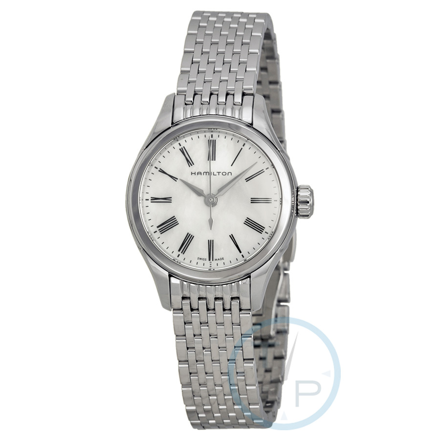Stainless steel case with a stainless steel bracelet. Fixed stainless steel bezel. Mother of pearl dial with silver-tone hands and index hour markers. Minute markers around the outer rim. Dial Type: Analog. Quartz movement. Scratch resistant sapphire crystal. Pull / push crown. Solid case back. Case diameter: 26 mm. Round case shape. Band width: 18 mm. Deployment clasp. Water resistant at 50 meters / 165 feet. Functions: hour, minute, second. Casual watch style. Hamilton Timeless Classic Valiant Mother of Pearl Dial Stainless Steel Ladies Watch H39251194.