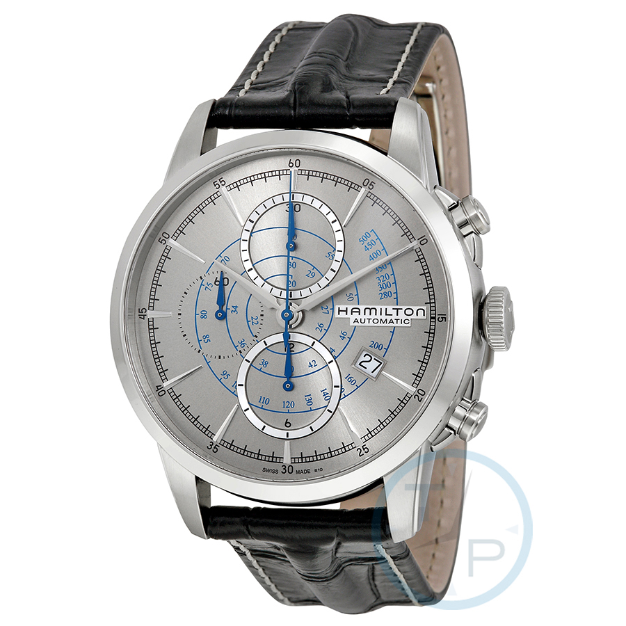 Stainless steel case with a black (alligator) leather strap. Fixed stainless steel bezel. Silver grey dial with silver-tone hands and index hour markers. Minute markers. Tachymeter markings. Minute markers. Arabic numeral minute markers (at 5 minute intervals) around the outer rim. Dial Type: Analog. Date display at the 4 o'clock position. Chronograph - three sub-dials displaying: 60 second, 30 minute and 12 hour. Hamilton calibre H-21 automatic movement, based upon ETA 7750, containing 25 Jewels, bitting at 28800 vph, and has a power reserve of approximately 60 hours. Scratch resistant sapphire crystal. Pull / push crown. Transparent case back. Round case shape, case size: 42 mm, case thickness: 15 mm. Band width: 20 mm. Tang clasp. Water resistant at 50 meters / 165 feet. Functions: chronograph, tachymeter, date, hour, minute, second. Railroad Series. Dress watch style. Watch label: Swiss Made. Hamilton Railroad Chronograph Automatic Mens Watch H40656781.