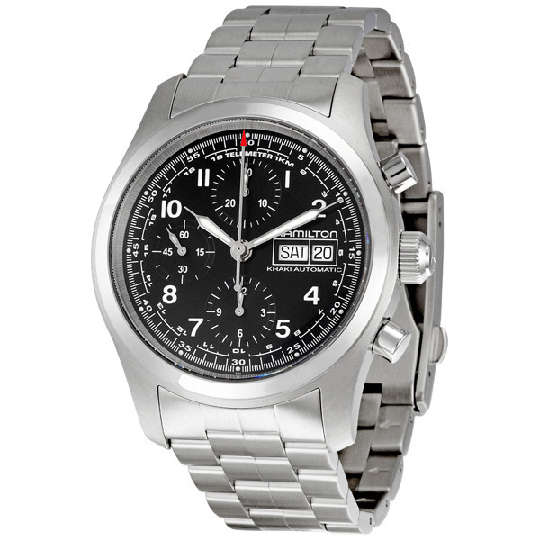 Silver-tone stainless steel case with a silver-tone stainless steel bracelet. Fixed silver-tone stainless steel bezel. Black dial with luminous hands and Arabic numeral hour markers. Minute markers around the outer rim. Dial Type: Analog. Luminescent hands and markers. Day of the week and date display at the 3 o'clock position. Chronograph - three sub-dials displaying: 12 hours, 30 minutes, and 60 seconds. ETA-Valjoux Caliber 7750 Automatic movement, containing 25 Jewels, bitting at 28800 vph, and has a power reserve of approximately 44 hours. Scratch resistant sapphire crystal. Skeleton case back. Round case shape, case size: 42 mm, case thickness: 15 mm. Deployment clasp. Water resistant at 100 meters / 330 feet. Functions: hours, minutes, seconds, calendar, chronograph. Casual watch style. Watch label: Swiss Made. Item Variations: H-71516137 / 71516137. Hamilton Khaki Field Black Dial Chronograph Automatic Mens Watch H71516137.
