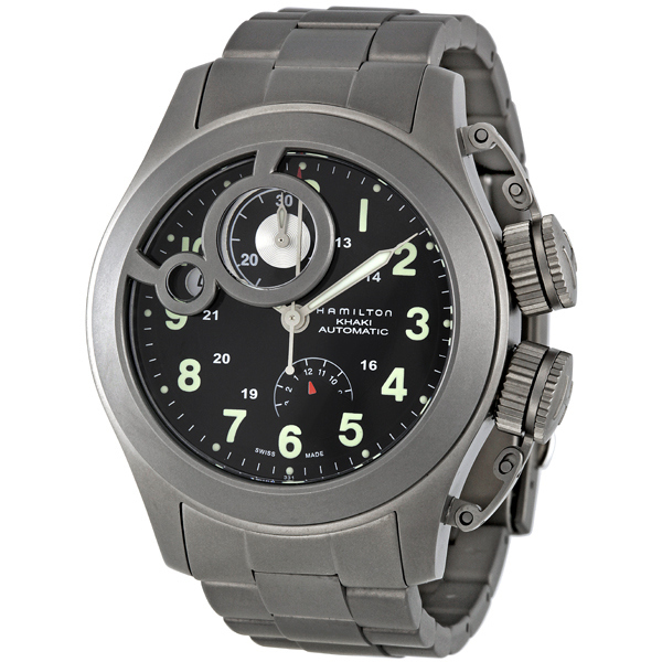 Grey titanium case with a grey titanium bracelet. Fixed grey titanium bezel. Black dial with luminous hands and Arabic numeral hour markers. Minute markers around the outer rim. Dial Type: Analog. Luminescent hands and markers. Date display between 9 and 10 o'clock position. Chronograph - two sub-dials displaying: 12 hours and 30 minutes. ETA-Valjoux Caliber 7750 Automatic movement, containing 25 Jewels, bitting at 28800 vph, and has a power reserve of approximately 44 hours. Scratch resistant sapphire crystal. Screw down crown. Skeleton case back. Round case shape, case size: 43 mm. Band width: 22 mm, band length: 9 inches. Deployment clasp. Water resistant at 200 meters / 660 feet. Functions: hours, minutes, seconds, date, chronograph, GMT. Khaki Navy Frogman Series. Casual watch style. Watch label: Swiss Made. Hamilton Khaki Navy Frogman Black Dial Mens Watch H77746133.
