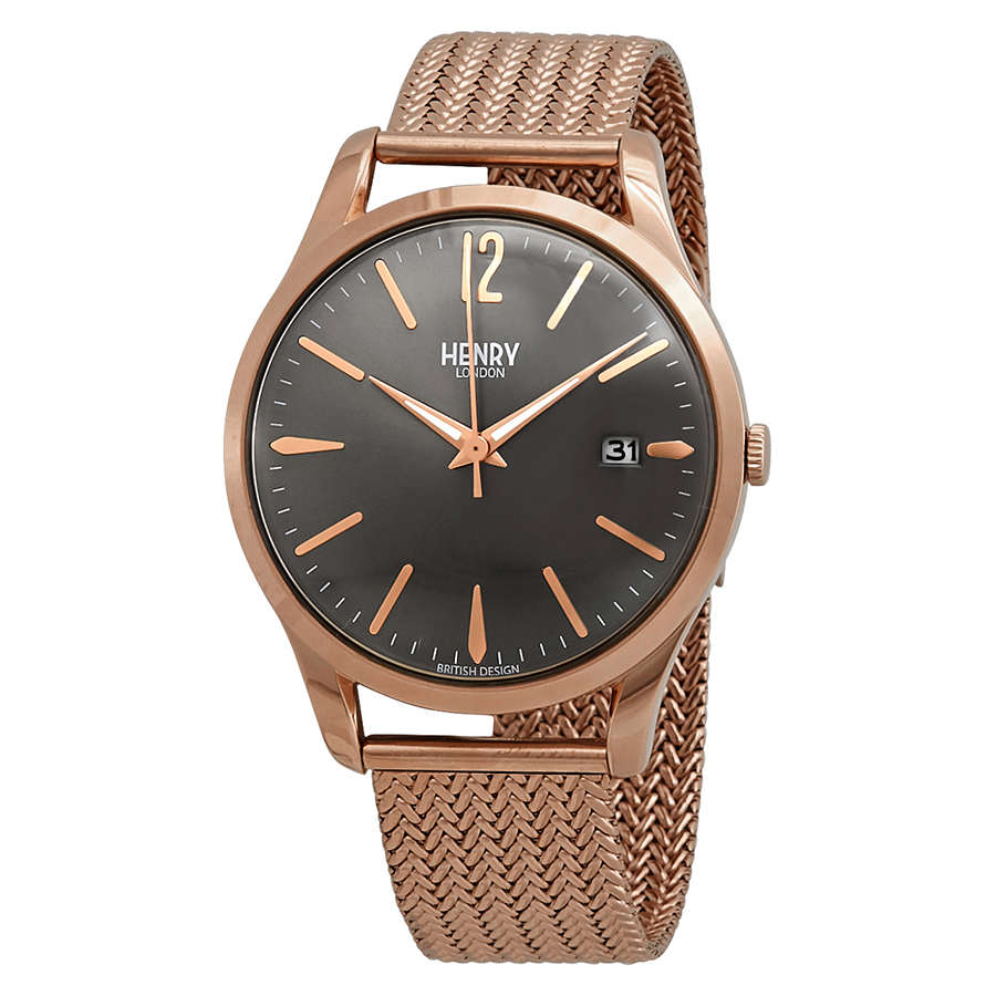 Rose gold-tone stainless steel case with a rose gold-tone stainless steel milanese mesh bracelet. Fixed rose gold-tone stainless steel bezel. Grey dial with rose gold-tone hands and Arabic numeral and index hour markers. Minute markers around the outer rim. Dial Type: Analog. Luminescent hands. Date display at the 3 o'clock position. Miyota Caliber 2315 quartz movement. Scratch resistant mineral crystal. Pull / push crown. Solid case back. Round case shape, case size: 39 mm, case thickness: 8 mm. Band width: 18 mm. Fold over clasp. Water resistant at 30 meters / 100 feet. Functions: date, hour, minute, second. Dress watch style. Watch label: Japan Movt. Henry London Finchley Grey Dial Watch HL39-M-0118.