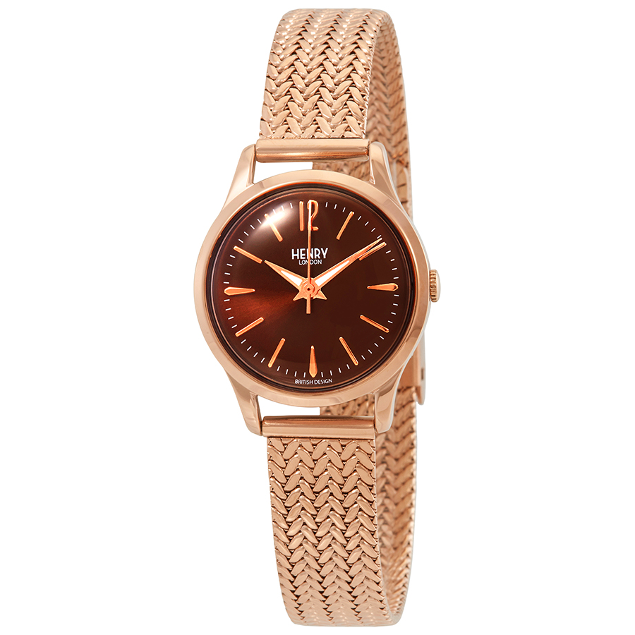 Rose gold-tone stainless steel case with a rose gold-tone stainless steel milanese mesh bracelet. Fixed rose gold-tone bezel. Chocolate brown dial with luminous rose gold-tone hands and index hour markers. An Arabic numerals appear at the 12 o'clock position. Minute markers around the outer rim. Dial Type: Analog. Luminescent hands. Miyota caliber 2033 quartz movement. Scratch resistant mineral crystal. Pull / push crown. Solid case back. Round case shape. Case size: 25 mm. Case thickness: 7 mm. Band width: 12 mm. Fold over clasp. Water resistant at 30 meters / 100 feet. Functions: hour, minute, second. Harrow Series. Casual watch style. Watch label: Japan Movt. Henry London Harrow Chocolate Brown Dial Ladies Watch HL25-M-0044.