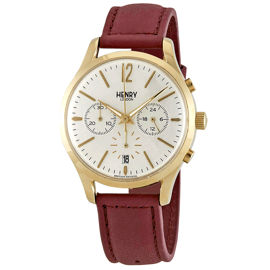 Gold-tone stainless steel case with a red leather strap. Fixed gold-tone stainless steel bezel. White dial with luminous gold-tone hands and index hour markers. Arabic numeral appears at the 12 o'clock position. minute markers around the outer rim. Dial Type: Analog. Luminescent hands. Date display at the 6 o'clock position. Chronograph - three sub-dials displaying: 60 second, 30 minute and 24 hour. Quartz movement. Scratch resistant mineral crystal. Screw down crown. Solid case back. Round case shape, case size: 39 mm, case thickness: 8 mm. Band width: 18 mm. Tang clasp. Water resistant at 30 meters / 100 feet. Functions: chronograph, date, hour, minute, second. Holborn Series. Casual watch style. Watch label: Japan Movt. Henry London Holborn Chronograph White Dial Unisex Watch HL39-CS-0070.