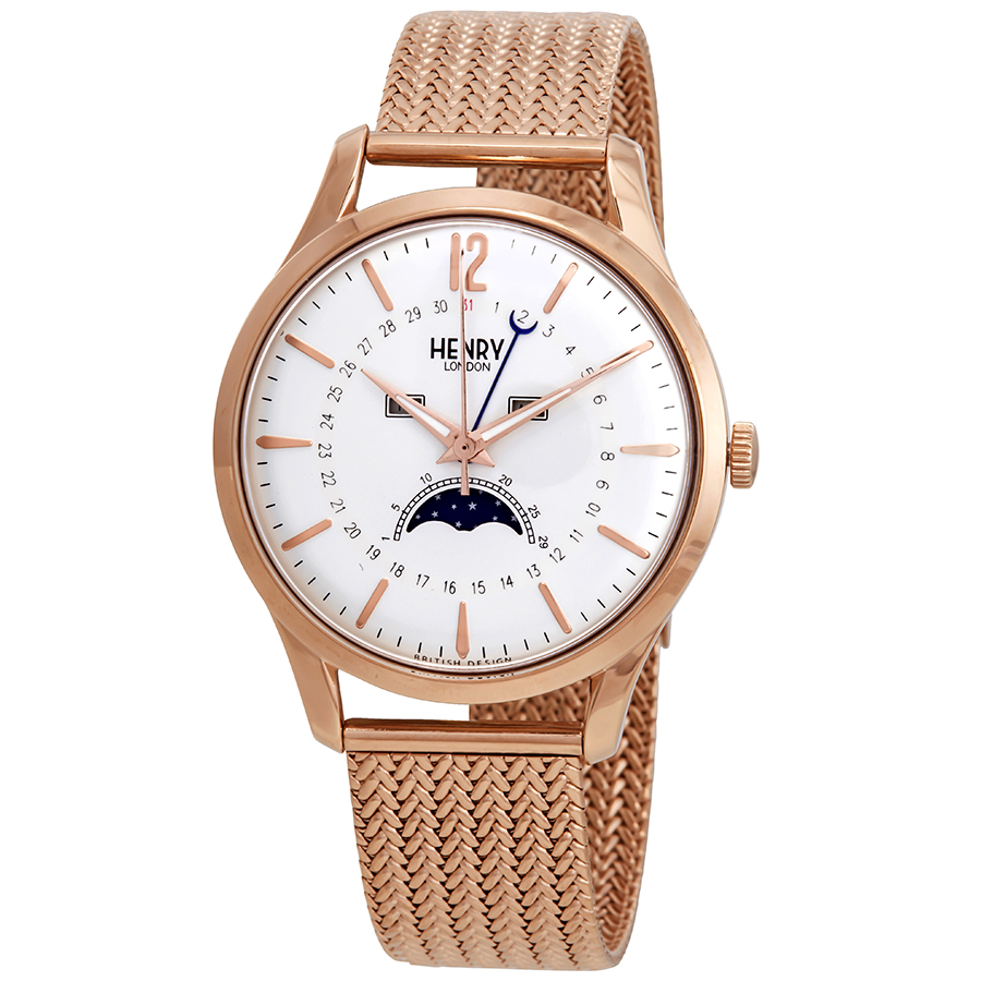 Rose gold PVD stainless steel case with a rose gold PVD stainless steel milanese mesh bracelet. Fixed rose gold PVD stainless steel bezel. Silver white dial with luminous rose gold-tone hands and index hour markers. Arabic numeral appears at the 12 o'clock position. date scale around an inner ring. minute markers around the outer rim. Dial Type: Analog. Luminescent hands. Pointer date. One subdial displaying: moonphase. Quartz movement. Scratch resistant mineral crystal. Pull / push crown. Solid case back. Round case shape, case size: 39 mm, case thickness: 8 mm. Band width: 18 mm. Fold over clasp. Water resistant at 30 meters / 100 feet. Functions: date, day, month, hour, minute, second, moonphase. Richmond Series. Casual watch style. Watch label: Japan Movt. Henry London Richmond Silver White Dial Moonphase Unisex Watch HL39-LM-0162.