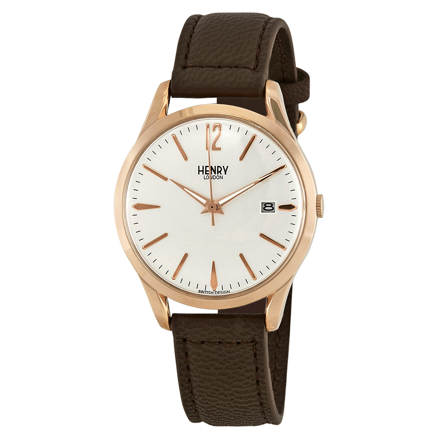 Rose gold-tone stainless steel case with a brown leather strap. Fixed rose gold-tone bezel. White dial with rose gold-tone hands and index hour markers. An Arabic numeral appears at the 12 o'clock position. Minute markers around the outer rim. Dial Type: Analog. Luminescent hands. Date display at the 3 o'clock position. Miyota caliber 2315 quartz movement. Scratch resistant mineral crystal. Pull / push crown. Solid case back. Round case shape. Case size: 39 mm. Case thickness: 8 mm. Band width: 18 mm. Tang clasp. Water resistant at 30 meters / 100 feet. Functions: date, hour, minute, second. Casual watch style. Watch label: Japan Movt. Henry London Richmond White Dial Unisex Watch HL39-S-0028.