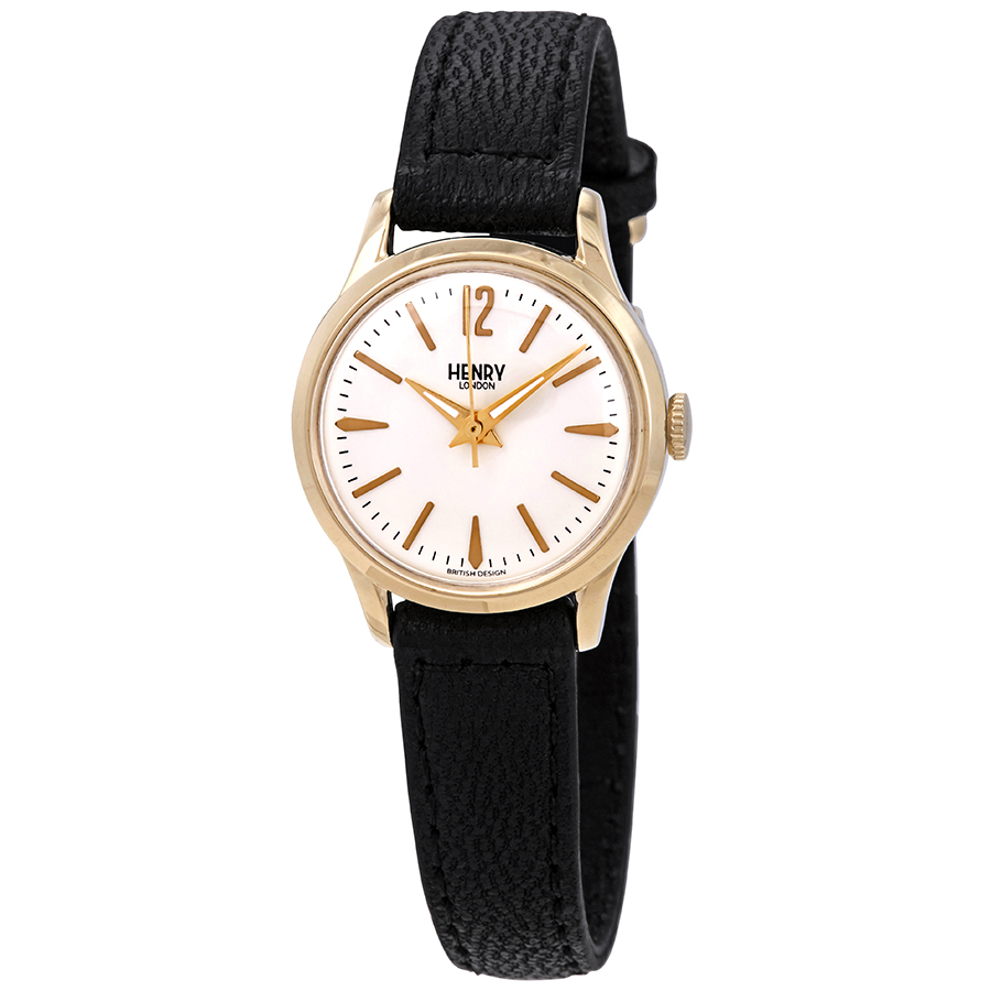 Gold-tone stainless steel case with a black leather strap. Fixed gold-tone stainless steel bezel. White dial with gold-tone hands and Arabic numeral and index hour markers. Minute markers around the outer rim. Dial Type: Analog. Luminescent hands. Miyota Caliber 2033 quartz movement. Scratch resistant mineral crystal. Pull / push crown. Solid case back. Round case shape, case size: 25 mm, case thickness: 7 mm. Band width: 12 mm. Buckle clasp. Water resistant at 30 meters / 100 feet. Functions: hour, minute, second. Casual watch style. Watch label: Japan Movt. Henry London Westminster White Dial Ladies Watch HL25-S-0002.