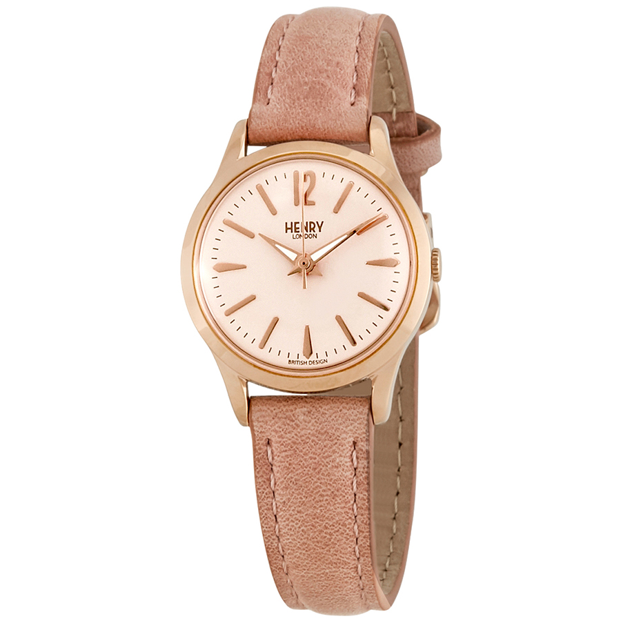 Rose gold-tone stainless steel case with a pink leather strap. Fixed rose gold-tone stainless steel bezel. Pink dial with luminous rose gold-tone hands and index hour markers. Arabic numeral appears at the 12 o'clock position. minute markers around the outer rim. Dial Type: Analog. Luminescent hands. Miyota Caliber 2033 quartz movement. Scratch resistant mineral crystal. Pull / push crown. Solid case back. Round case shape, case size: 25 mm, case thickness: 7 mm. Band width: 12 mm. Tang clasp. Water resistant at 30 meters / 100 feet. Functions: hour, minute, second. Casual watch style. Watch label: Japan Movt. Henry London Shoreditch Pink Dial Ladies Watch HL25-S-0170.