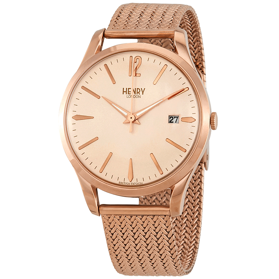 Rose gold-tone stainless steel case with a rose gold-tone stainless steel milanese mesh bracelet. Fixed rose gold-tone stainless steel bezel. Pink dial with rose gold-tone hands and Arabic numeral and index hour markers. Minute markers around the outer rim. Dial Type: Analog. Luminescent hands. Date display at the 3 o'clock position. Miyota Caliber 2315 quartz movement. Scratch resistant mineral crystal. Pull / push crown. Solid case back. Round case shape, case size: 39 mm, case thickness: 8 mm. Band width: 18 mm. Fold over clasp. Water resistant at 30 meters / 100 feet. Functions: date, hour, minute, second. Dress watch style. Watch label: Japan Movt. Henry London Shoreditch Pink Dial Unisex Watch HL39-M-0166.