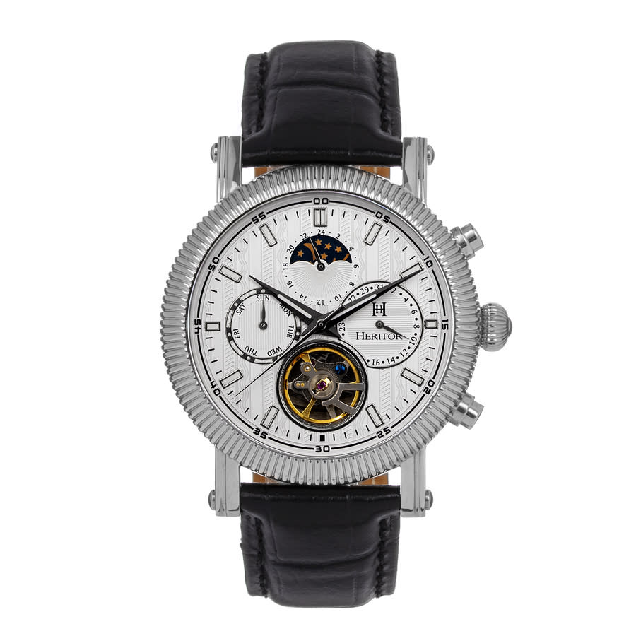 Band Color: Black Genuine Leather; Band Width: 22mm near case; 20mm near clasp/buckle; Bezel Color: Silver; Case: Silver + Circle-Shaped; Case Finish: Polished + Stainless Steel; Case Thickness: 14mm; Case Width: 44mm; 48mm with Crown; Clasp / Buckle: Strap Buckle; Dial: White + Analog; Hand Color: Silver; Movement: Chinese + Automatic; Time Zones: Single; Water Resistance: 10 ATM.