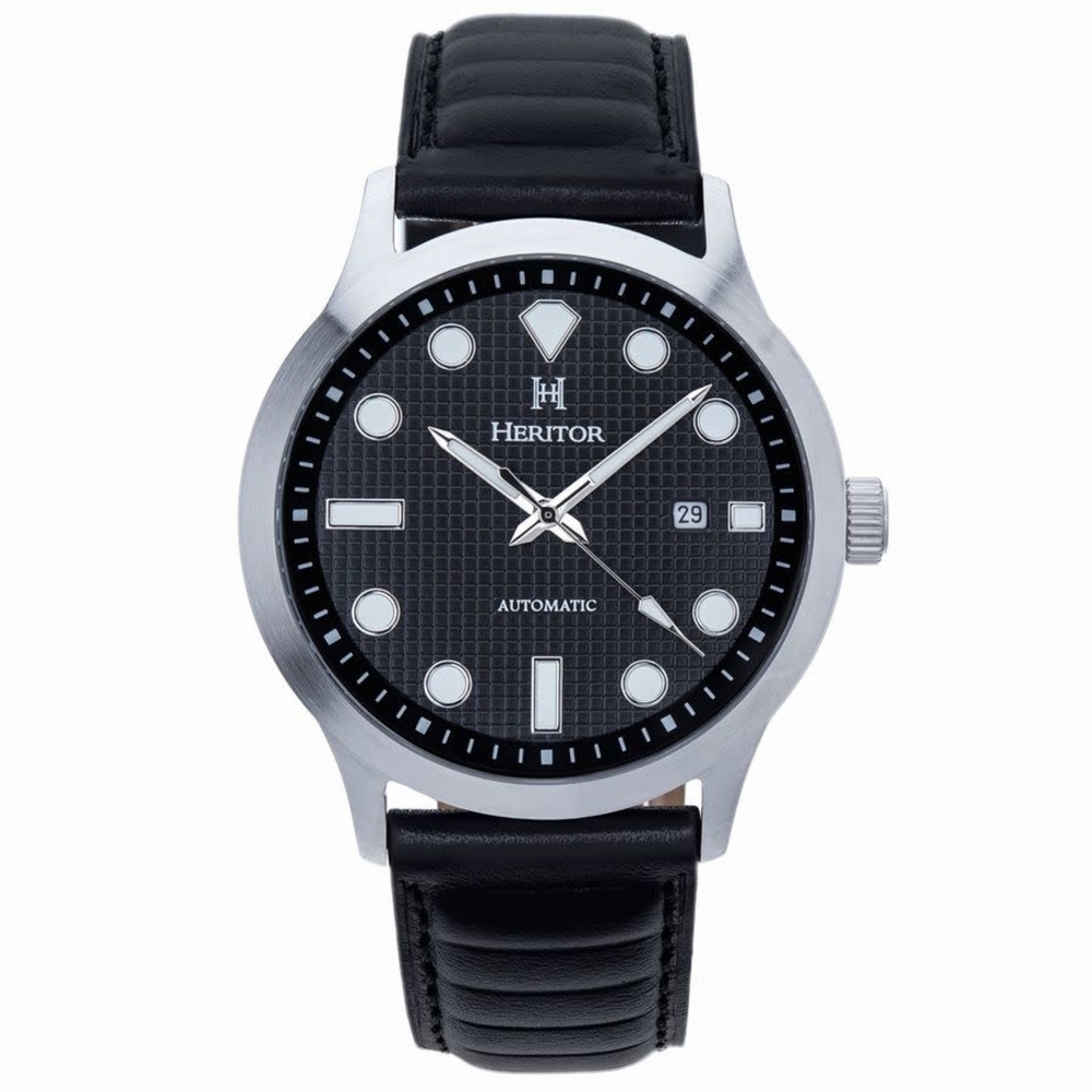 Band Color: Black Genuine Leather; Band Width: 22mm near case; 20mm near clasp/buckle; Bezel Color: Silver; Case: Silver + Circle-Shaped; Case Finish: Brushed + Stainless Steel; Case Thickness: 14mm; Case Width: 43mm; 46mm with Crown; Clasp / Buckle: Strap Buckle; Dial: Black + Analog; Hand Color: Silver; Movement: Japanese + Automatic; Time Zones: Single; Water Resistance: 10 ATM.
