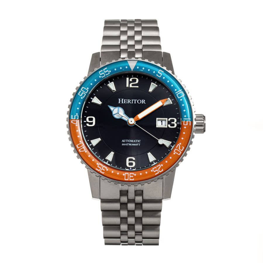 Silver-tone stainless steel case and bracelet. Uni-directional rotating two-tone (blue & orange) stainless steel bezel. Black dial with blue & orange Mercedes-style shape hands and Arabic numeral & index hour markers. Minute scale around the inner rim. Dial Type: Analog. Luminescent hands and markers. Date display at the 3 o'clock position. Automatic movement. Scratch resistant mineral crystal. Screw down crown. Transparent case back. Round case shape, case size: 45 mm, case thickness: 15 mm. Band width: 22 mm, band length: 9.25 inches. Fold over with double push button release clasp. Water resistant at 200 meters / 660 feet. Functions: date, hour, minute, second. Dominic Series. Casual watch style. Watch label: Japan Movt. Heritor Dominic Automatic Black Dial Mens Watch HERHR9805.