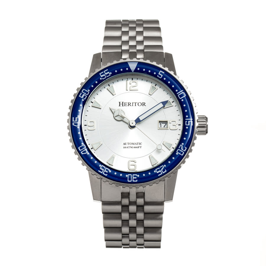 Silver-tone stainless steel case and bracelet. Uni-directional rotating blue stainless steel bezel. Silver-tone dial with silver-tone & blue Mercedes-style shape hands and Arabic numeral & index hour markers. Minute scale around the inner rim. Dial Type: Analog. Luminescent hands and markers. Date display at the 3 o'clock position. Automatic movement. Scratch resistant mineral crystal. Screw down crown. Transparent case back. Round case shape, case size: 45 mm, case thickness: 15 mm. Band width: 22 mm, band length: 9.25 inches. Fold over with double push button release clasp. Water resistant at 200 meters / 660 feet. Functions: date, hour, minute, second. Dominic Series. Casual watch style. Watch label: Japan Movt. Heritor Dominic Automatic Silver Dial Mens Watch HERHR9801.