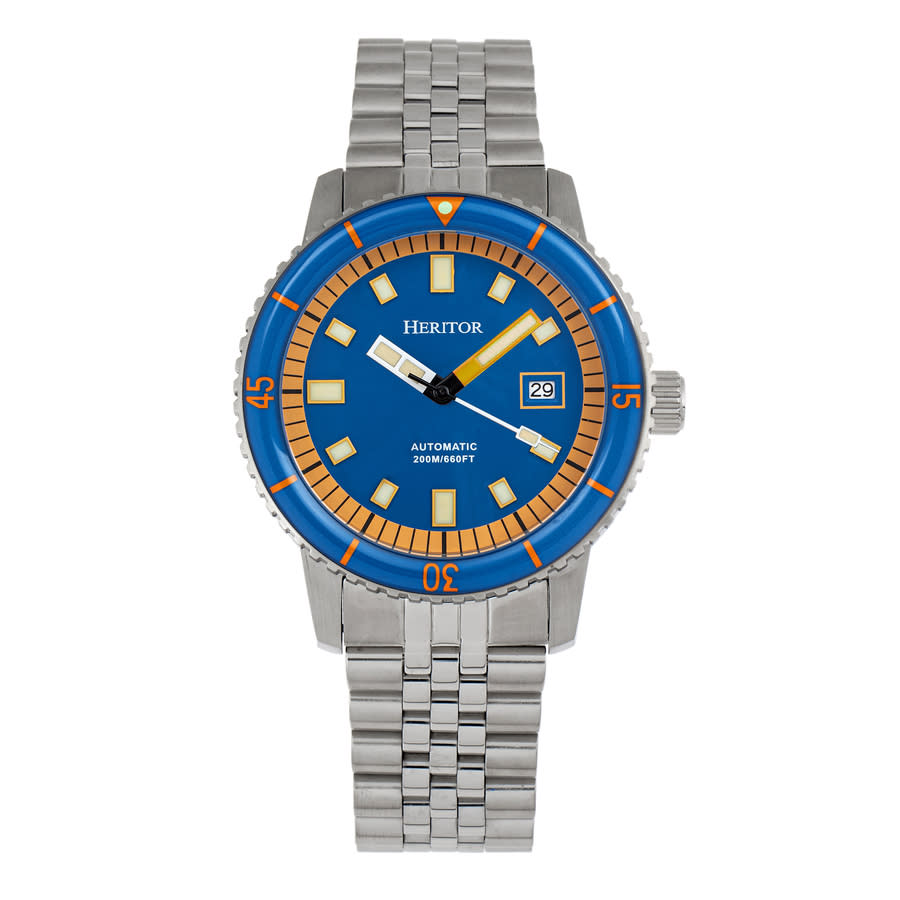 Band Color: Silver Stainless Steel; Band Width: 21mm near case; 20mm near clasp/buckle; Bezel Color: Navy; Case: Silver + Circle-Shaped; Case Finish: Brushed + Stainless Steel; Case Thickness: 15mm; Case Width: 45mm; 48mm with Crown; Clasp / Buckle: Fold Over Push Button Deployment; Dial: Navy + Analog; Hand Color: White; Movement: Japanese + Automatic; Time Zones: Single; Water Resistance: 20 ATM.