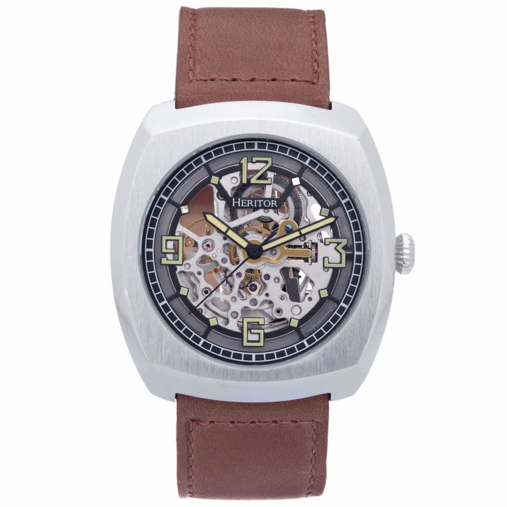 Band Color: Light Brown Genuine Leather; Band Width: 24mm near case; 22mm near clasp/buckle; Bezel Color: Silver; Case: Silver + Square-Shaped; Case Finish: Brushed + Stainless Steel; Case Thickness: 11mm; Case Width: 44mm; 47mm with Crown; Clasp / Buckle: Strap Buckle; Dial: Black + Analog; Hand Color: Black; Movement: Chinese + Automatic; Time Zones: Single; Water Resistance: 5 ATM.