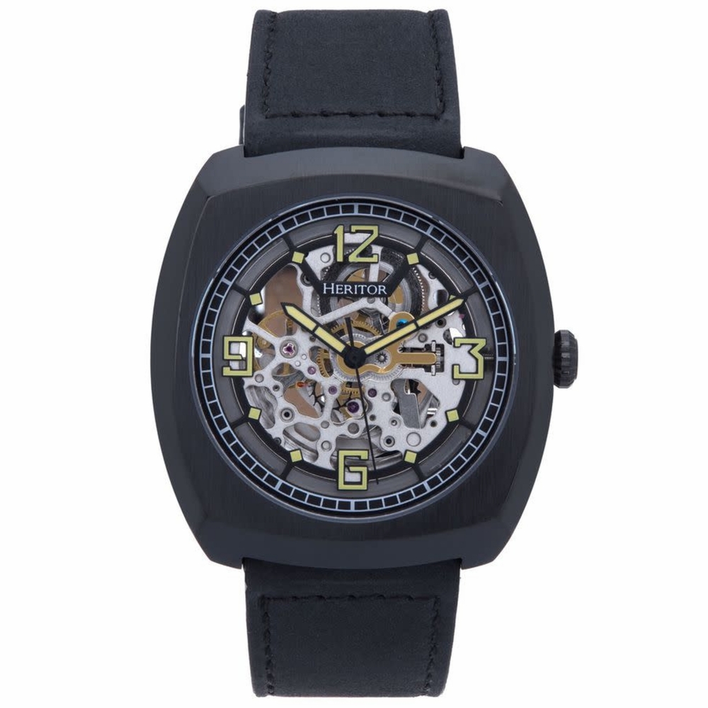 Band Color: Black Genuine Leather; Band Width: 24mm near case; 22mm near clasp/buckle; Bezel Color: Black; Case: Black + Square-Shaped; Case Finish: Brushed + Stainless Steel; Case Thickness: 11mm; Case Width: 44mm; 47mm with Crown; Clasp / Buckle: Strap Buckle; Dial: Black + Analog; Hand Color: Black; Movement: Chinese + Automatic; Time Zones: Single; Water Resistance: 5 ATM.
