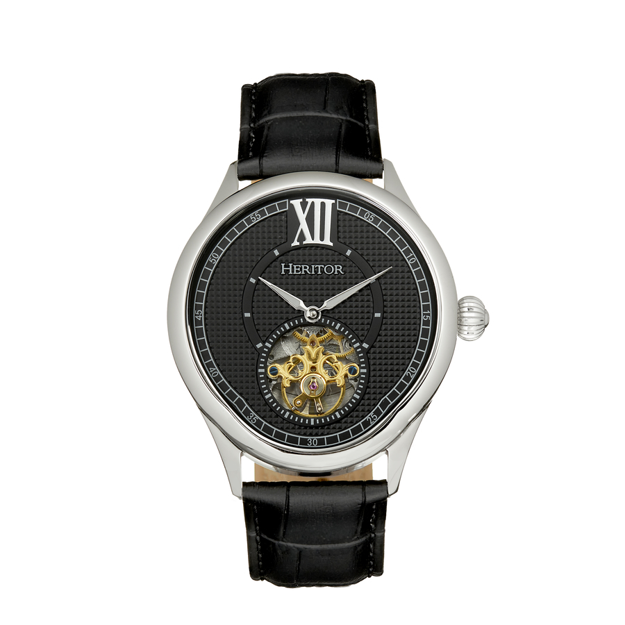 Silver-tone stainless steel case with a black genuine leather strap. Fixed silver-tone stainless steel bezel. Black dial with silver-tone alpha-style shape hands and Roman numeral & index hour markers. Minute scale around the inner rim. Dial Type: Analog. Luminescent hands. Automatic movement with a 36-hour power reserve. Scratch resistant mineral crystal. Pull / push crown. Semi-transparent case back. Round case shape, case size: 45 mm, case thickness: 13 mm. Band width: 22 mm, band length: 9.25 inches. Buckle clasp. Water resistant at 50 meters / 165 feet. Functions: hour, minute, second. Casual watch style. Heritor Hayward Automatic Black Dial Mens Watch HERHR9402.