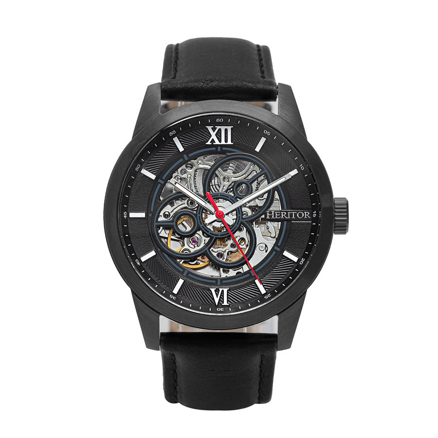 Black-plated stainless steel case with a black leather strap. Fixed black-plated bezel. Black (skeleton center) dial with luminous silver-tone hands and index hour markers. Roman numerals appear at the 6 and 12 o'clock positions. Arabic numeral minute markers (at 5 minute intervals). Minute markers around the outer rim. Dial Type: Analog. Luminescent hands and markers. Automatic movement. Scratch resistant mineral crystal. Pull / push crown. Transparent case back. Round case shape. Case size: 43 mm. Case thickness: 15 mm. Band width: 21 mm. Band length: 9 inches. Tang clasp. Water resistant at 100 meters / 330 feet. Functions: hour, minute, second. Jonas Series. Casual watch style. Watch label: Chinese Movt. Heritor Jonas Black Dial Mens Watch HERHR9506.