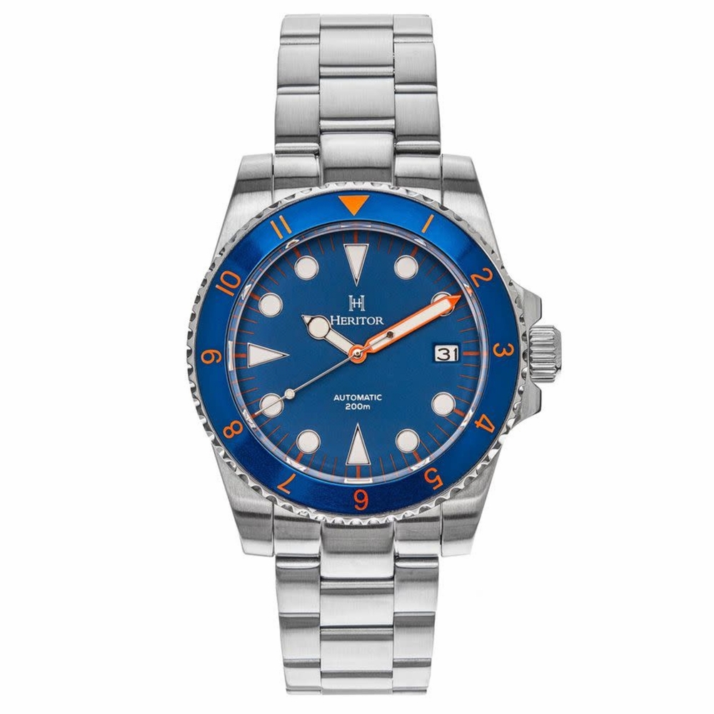 Band Color: Silver Stainless Steel; Band Width: 20mm near case; 18mm near clasp/buckle; Bezel Color: Navy; Case: Silver + Circle-Shaped; Case Finish: Polished + Stainless Steel; Case Thickness: 15mm; Case Width: 41mm; 45mm with Crown; Clasp / Buckle: Fold Over Push Button Deployment; Dial: Blue + Analog; Hand Color: Silver & Orange; Movement: Japanese + Automatic; Time Zones: Single; Water Resistance: 20 ATM.