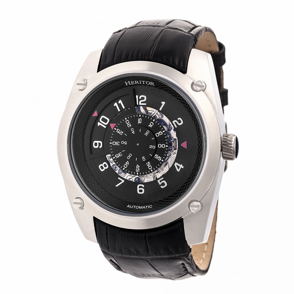 Silver-tone stainless steel case with a black genuine leather strap. Fixed silver-tone stainless steel bezel. Black dial with Arabic numeral hour markers. Middle disc represents minutes, inside disc represents seconds. Dial Type: Analog. Automatic movement with a 36-hour power reserve. Scratch resistant mineral crystal. Transparent case back. Round case shape, case size: 43 mm, case thickness: 15 mm. Band width: 24 mm. Buckle clasp. Water resistant at 100 meters / 330 feet. Functions: hour, minute, second. Dress watch style. Item Variations: HRT-HR7403. Heritor Daniels Automatic Black Dial Mens Watch HR7403.