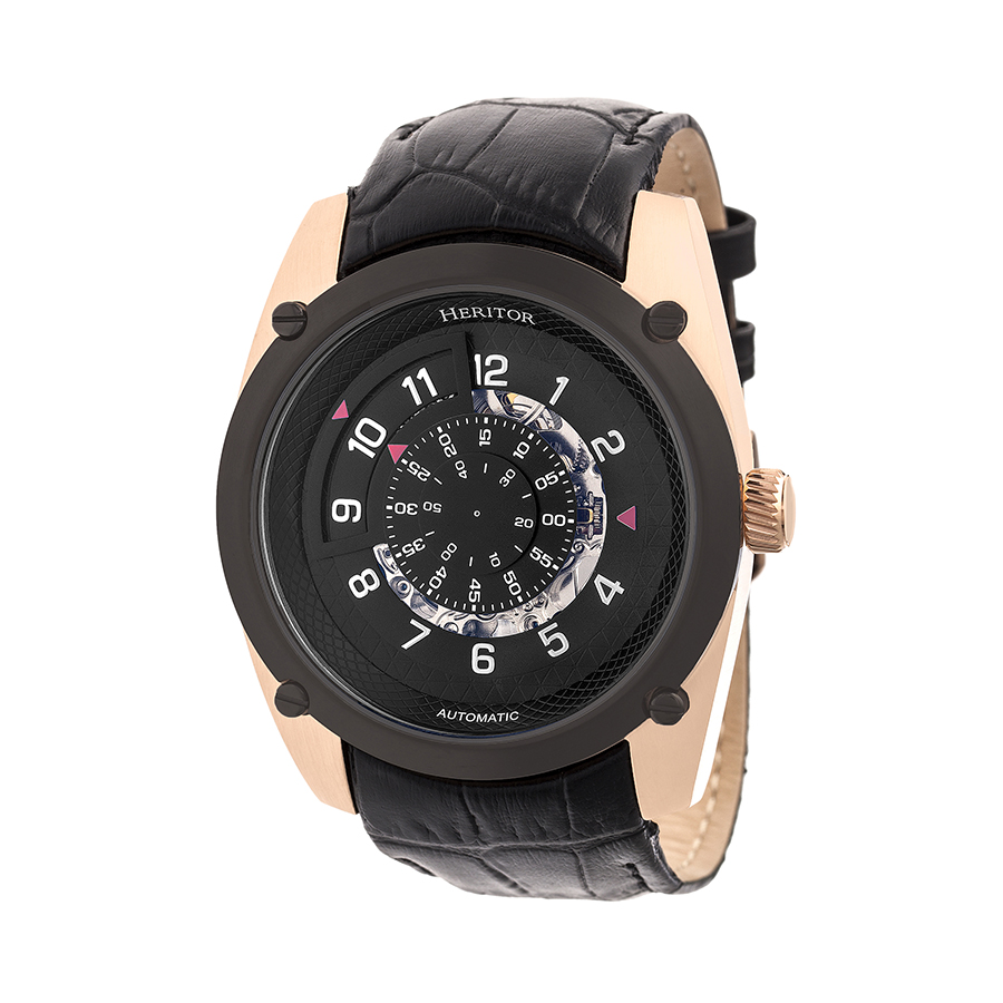 Rose gold-tone stainless steel case with a black genuine leather strap. Fixed black stainless steel bezel. Black dial with Arabic numeral hour markers. Middle disc represents minutes, inside disc represents seconds. Dial Type: Analog. Automatic movement with a 36-hour power reserve. Scratch resistant mineral crystal. Transparent case back. Round case shape, case size: 43 mm, case thickness: 15 mm. Band width: 24 mm. Buckle clasp. Water resistant at 100 meters / 330 feet. Functions: hour, minute, second. Dress watch style. Item Variations: HRT-HR7406. Heritor Daniels Automatic Black Dial Mens Watch HR7406.