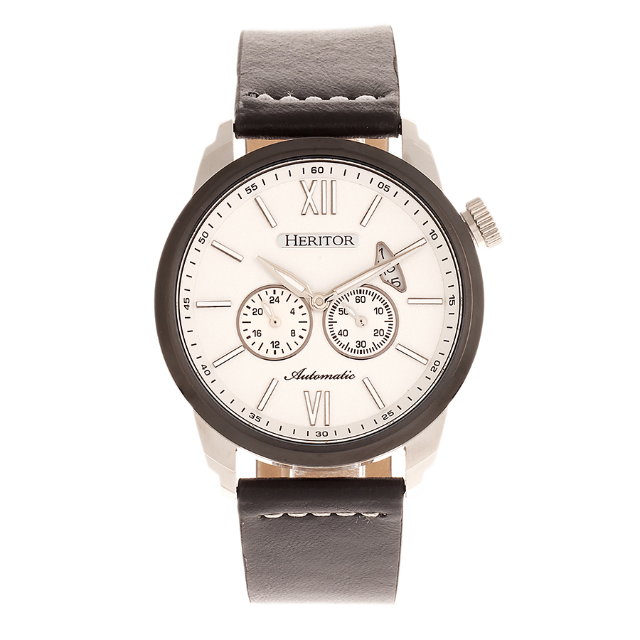 Silver-tone stainless steel case with a black genuine leather strap. Fixed black stainless steel bezel. White dial with silver-tone hands and Roman numeral and index hour markers. Minute markers around the outer rim. Dial Type: Analog. Luminescent hands and markers. Date display at the 2 o'clock position. Two - 24 hour, 60 second subdials. Automatic movement. Scratch resistant mineral crystal. Pull / push crown. Transparent case back. Round case shape, case size: 43 mm, case thickness: 13 mm. Band width: 22 mm. Buckle clasp. Water resistant at 50 meters / 165 feet. Functions: date, GMT, second time zone, hour, minute, small second. Casual watch style. Watch label: Japan Movt. Item Variations: HRT-HR8203. Heritor Wellington Automatic White Dial Mens Watch HR8203.