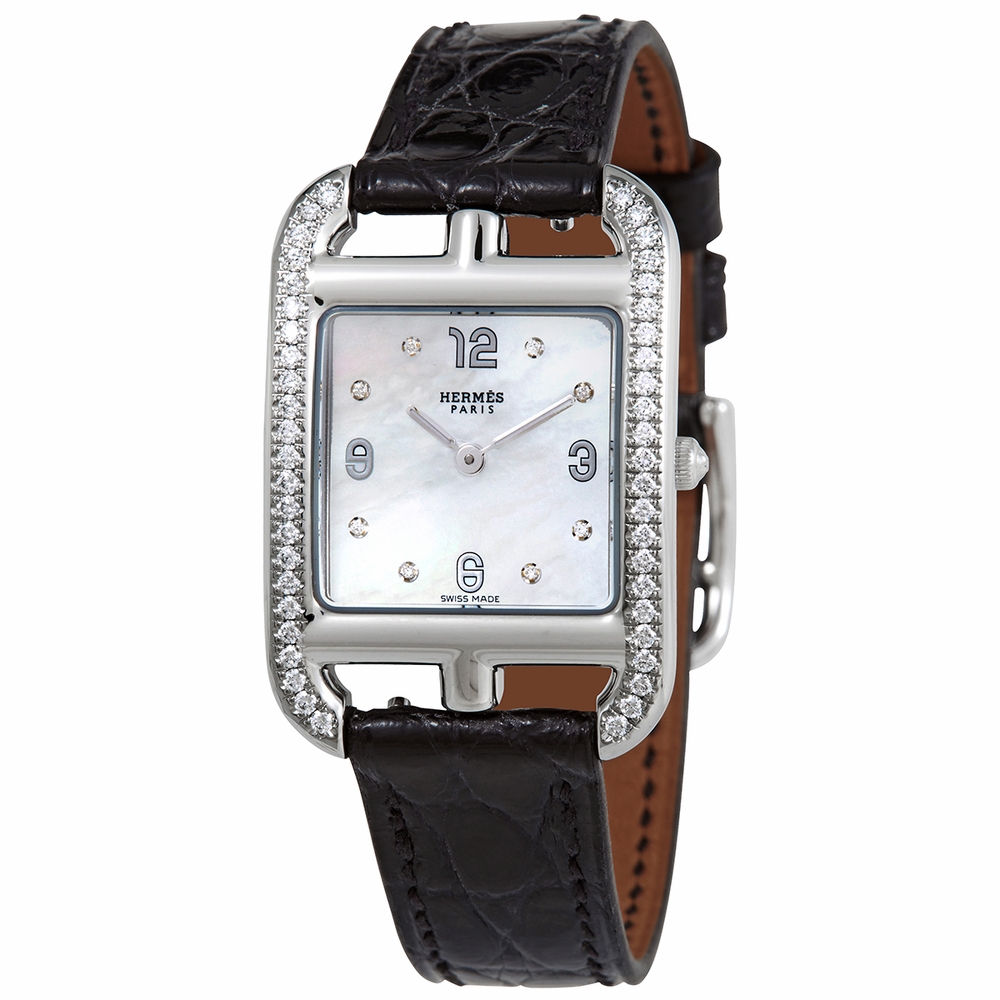 Silver-tone stainless steel case with a black alligator leather strap. Fixed stainless steel bezel. Mother of pearl dial with silver-tone hands and diamond- Arabic numerals hour markers. Dial Type: Analog. Quartz movement. Scratch resistant sapphire crystal. Pull / push crown. Solid case back. Square case shape, case size: 23 mm x 23 mm. Buckle clasp. Water resistant at 30 meters / 100 feet. Functions: hour, minute. Cape Cod Series. Dress watch style. Watch label: Swiss Made. Hermes Cape Cod Quartz Diamond Ladies Watch 044221WW00.
