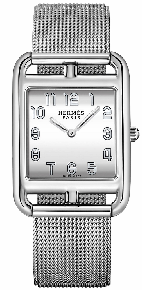 Stainless steel case with a stainless steel mesh bracelet. Fixed stainless steel bezel. Silver dial with silver-tone hands and Arabic numeral hour markers. Dial Type: Analog. Quartz movement. Scratch resistant sapphire crystal. Pull / push crown. Solid case back. Square case shape. Case size: 29 mm. Water resistant at 50 meters / 165 feet. Functions: hour, minute. Cape Cod Series. Luxury watch style. Watch label: Swiss Made. Hermes Cape Cod Quartz Silver Dial Ladies Watch 045235WW00.