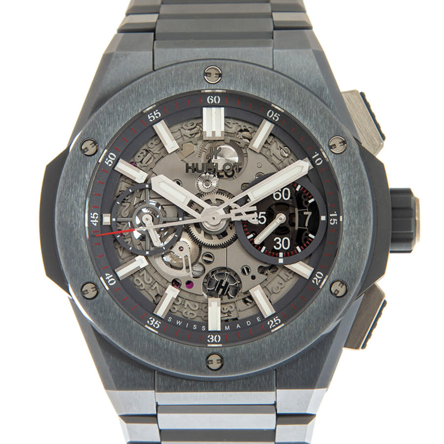 Black ceramic case with a grey ceramic bracelet. Fixed tachymeter scale ceramic bezel. Transparent dial with index hour markers. Dial Type: Analog. Date display at the 3 o'clock position. Chronograph - two sub-dials displaying: 60 minute and 60 second. Hublot Calibre HUB1280 Automatic movement, containing 43 Jewels, composed of 354 parts, bitting at 28800 vph, and has a power reserve of approximately 72 hours. Scratch resistant sapphire crystal. Screw down crown. Transparent see through case back. Round case shape, case size: 42 mm. Deployment clasp. Water resistant at 100 meters / 330 feet. Functions: chronograph, column wheel, hour, minute, second. Additional Info: original box, international warranty card, manual (complete accessories). Big Bang Series. Luxury watch style. Watch label: Swiss Made. Hublot Big Bang Integral Grey Ceramic Chronograph Automatic Mens Watch 451.FX.6923.FX.