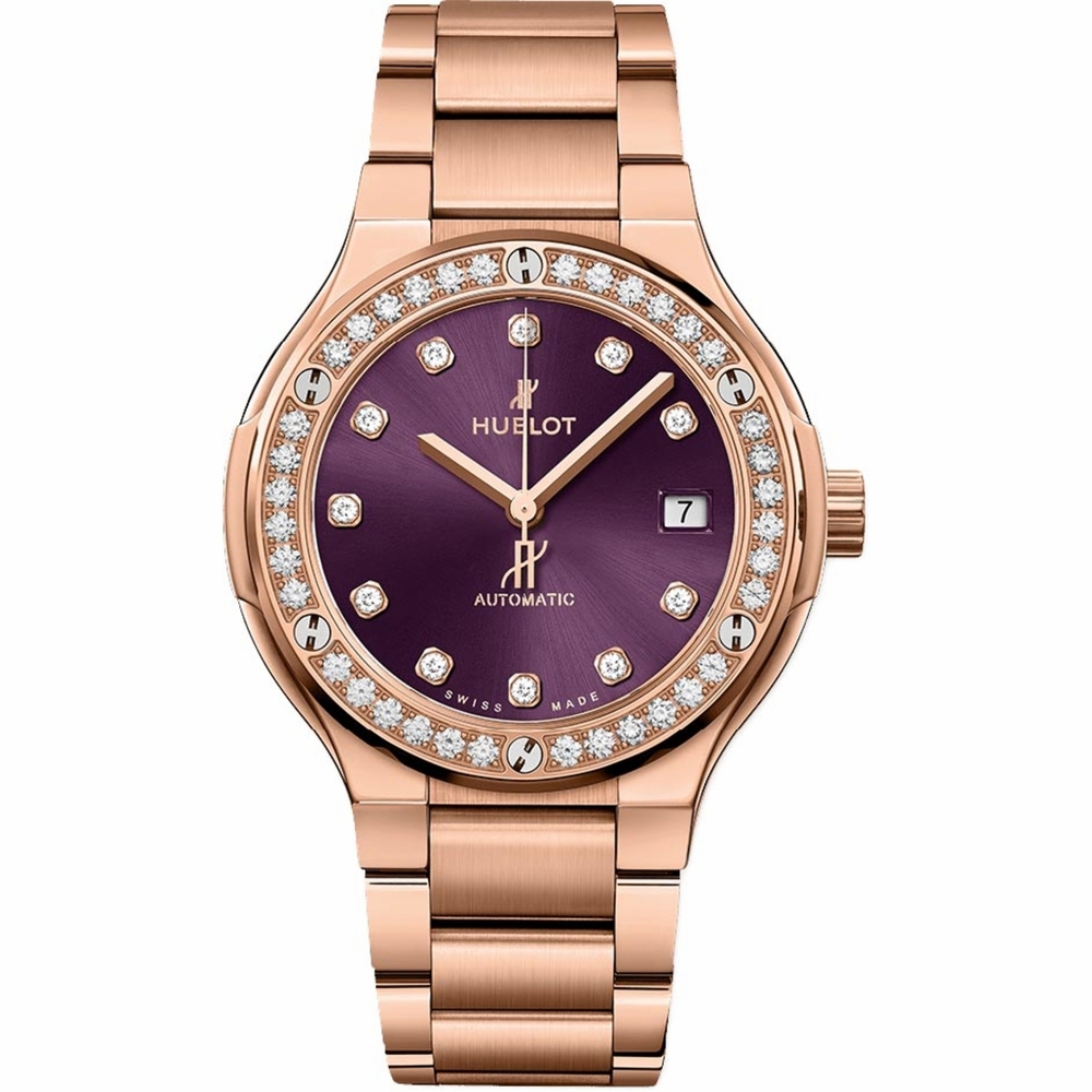 18kt rose gold case with a brushed & polished 18kt rose gold bracelet. Fixed 18kt rose gold bezel. Purple dial with rose gold hands and diamond hour markers. Dial Type: Analog. Date display at the 3 o'clock position. Hublot Calibre HUB1110 Automatic movement, based upon Sellita SW300-1, containing 21 Jewels, composed of 63 parts, bitting at 28800 vph, and has a power reserve of approximately 42 hours. Scratch resistant sapphire crystal. Pull / push crown. Transparent case back. Round case shape, case size: 38 mm. Push button folding clasp. Water resistant at 50 meters / 150 feet. Functions: date, hour, minute, second. Classic Fusion Series. Luxury watch style. Watch label: Swiss Made. Hublot Classic Fusion Automatic Diamond Purple Dial Mens Watch 568.OX.898V.OX.1204.
