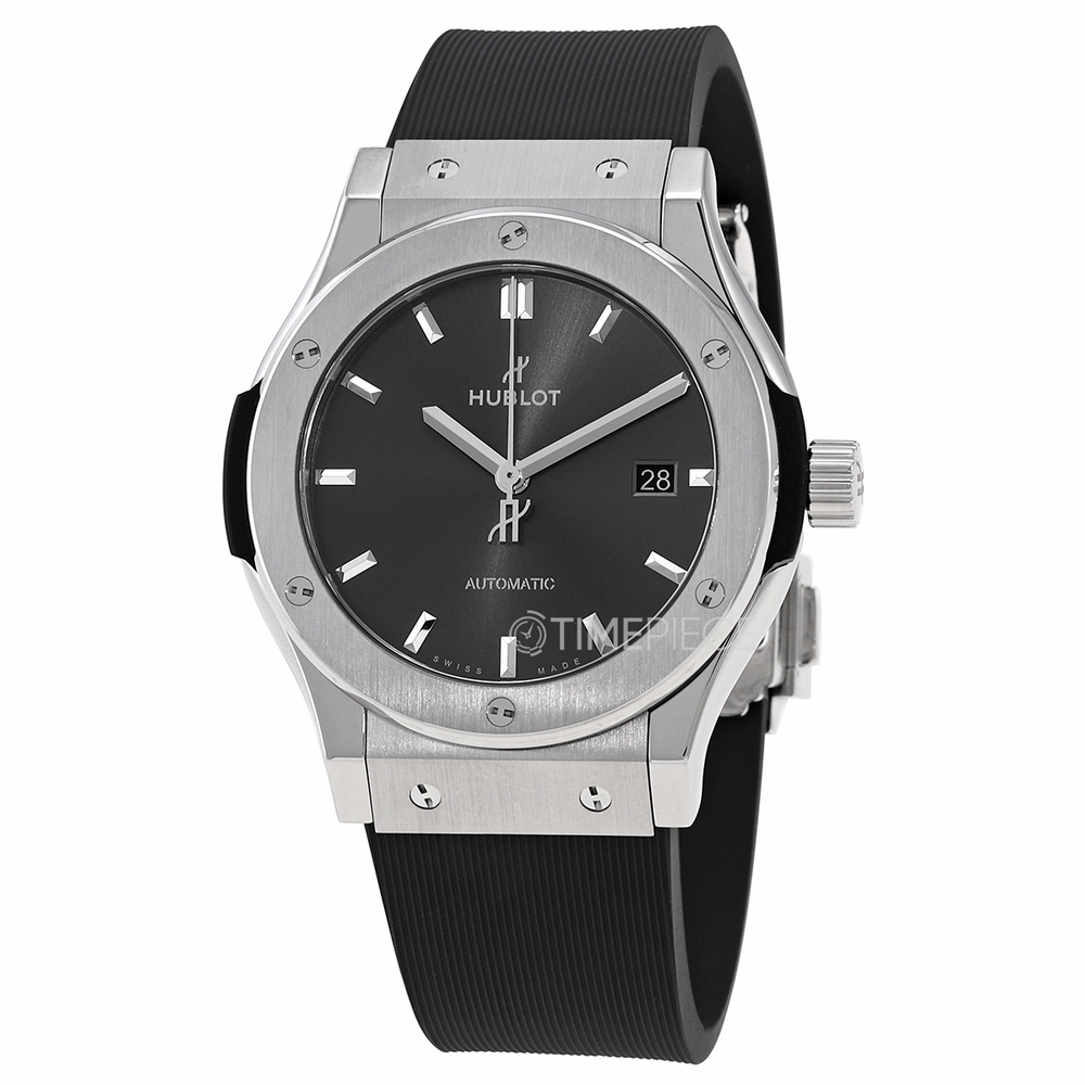 Grey titanium case with a grey rubber strap. Fixed grey titanium with a black bezel ring bezel. Grey dial with silver-tone hands and index hour markers. Dial Type: Analog. Date display at the 3 o'clock position. Hublot Calibre HUB1110 Automatic movement, based upon Sellita SW300-1, containing 21 Jewels, composed of 63 parts, bitting at 28800 vph, and has a power reserve of approximately 42 hours. Scratch resistant sapphire crystal. Transparent case back. Round case shape, case size: 42 mm. Deployment with push button release clasp. Water resistant at 50 meters / 165 feet. Functions: date, hour, minute, second. Additional Info: original box, manual (complete accessories). Classic Fusion Series. Luxury watch style. Watch label: Swiss Made. Hublot Classic Fusion Automatic Grey Dial Mens Watch 542.NX.7071.RX.