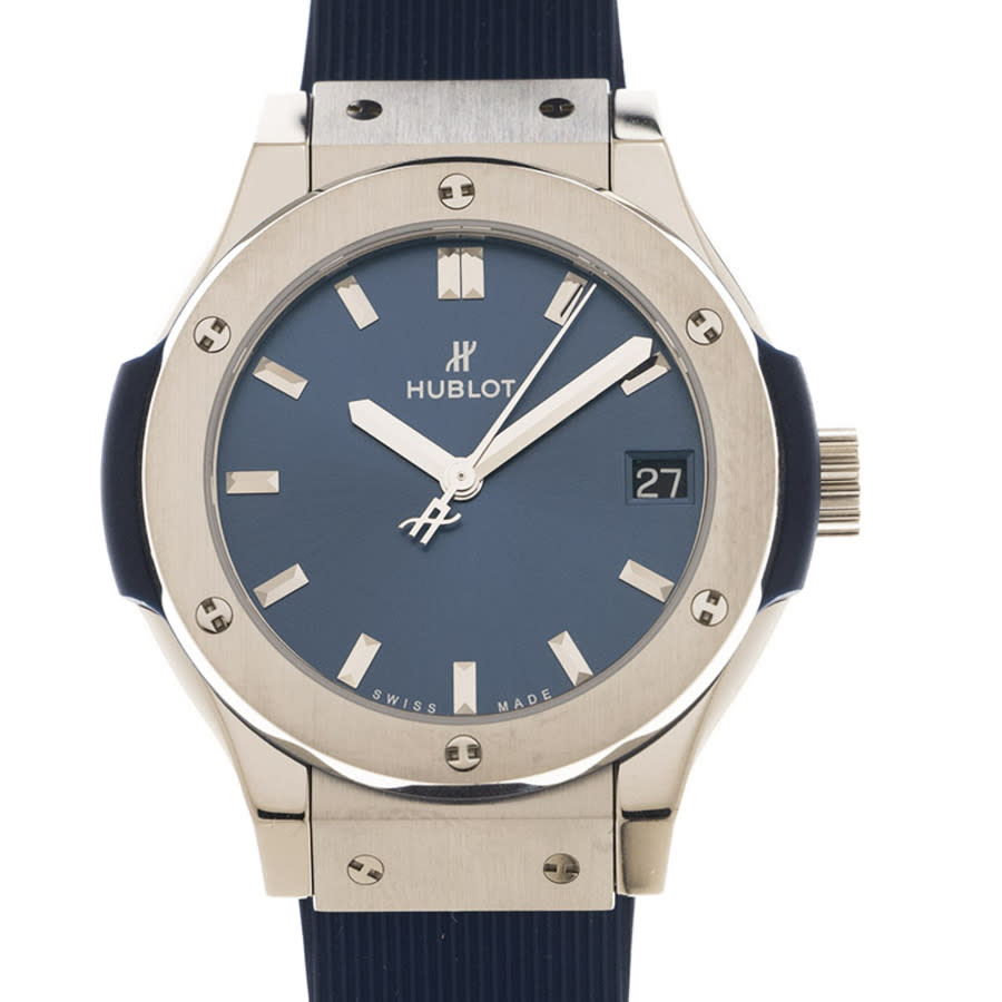 Silver-tone stainless steel case with a blue rubber strap. Fixed silver-tone stainless steel bezel. Blue dial with silver-tone hands and index hour markers. Dial Type: Analog. Date display at the 3 o'clock position. Hublot Calibre HUB2912 quartz movement. Scratch resistant sapphire crystal. Solid case back. Round case shape, case size: 33 mm. Deployment with push button release clasp. Water resistant at 50 meters / 165 feet. Functions: date, hour, minute, second. Additional Info: original box, international warranty card, manual (complete accessories). Classic Fusion Series. Luxury watch style. Watch label: Swiss Made. Hublot Classic Fusion Quartz Blue Dial Ladies Watch 581.NX.7170.RX.