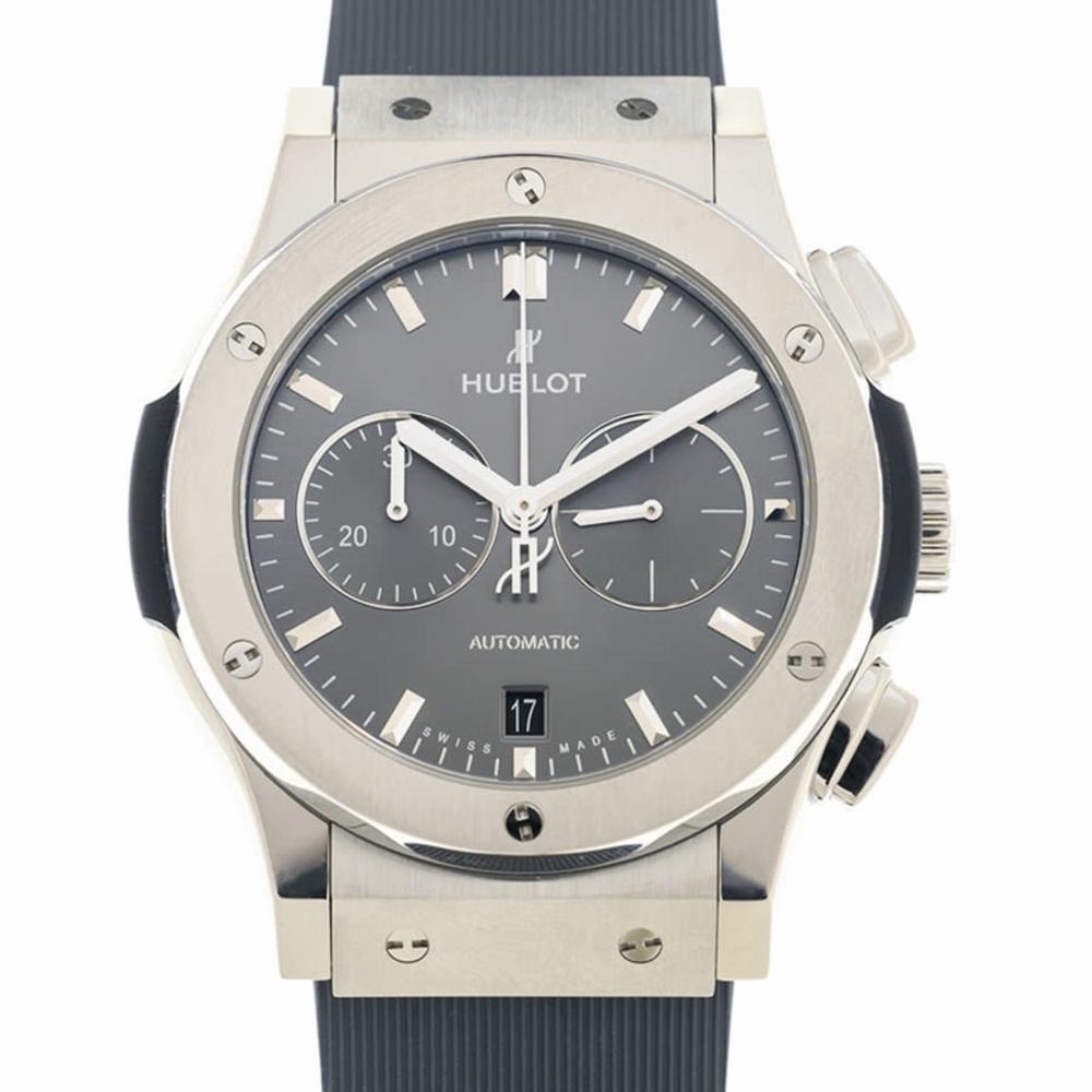 Grey titanium case with a grey rubber strap. Fixed grey titanium bezel. Grey dial with silver-tone hands and index hour markers. Minute markers around the outer rim. Dial Type: Analog. Luminescent hands and markers. Date display at the 6 o'clock position. Chronograph - two sub-dials displaying: 60 second and 30 minute. Hublot Calibre HUB1153 Automatic movement, containing 35 Jewels, composed of 155 parts, bitting at 28800 vph, and has a power reserve of approximately 42 hours. Scratch resistant sapphire crystal. Transparent see through case back. Round case shape, case size: 42 mm. Deployment with push button release clasp. Water resistant at 50 meters / 165 feet. Functions: chronograph, date, hour, minute, second. Additional Info: original box, international warranty card, manual (complete accessories). Classic Fusion Series. Luxury watch style. Watch label: Swiss Made. Hublot Classic Fusion Chronograph Automatic Grey Dial Mens Watch 541.NX.7070.RX.
