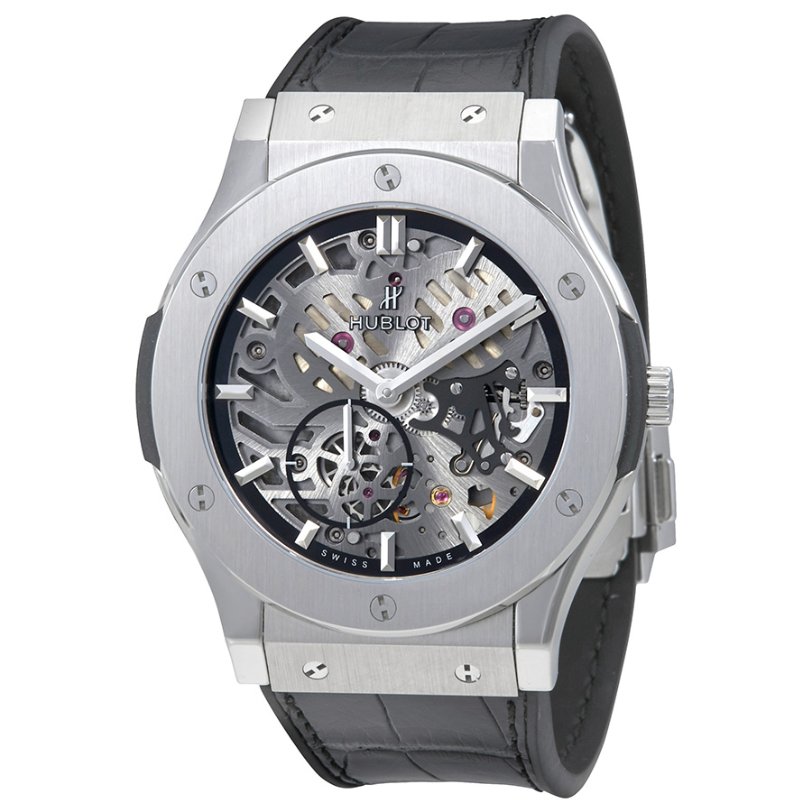 Polished and satin-finished titanium case with a black (alligator) rubber strap. Fixed, brushed titanium bezel. Skeleton dial with polished rhodium-plated appliques with rhodium-plated hands and index hour markers. 60 seconds sub-dial at the 7 o'clock position. Hand Wind movement with a 90-hour power reserve. Scratch resistant sapphire crystal. Fluted, screw down crown. Transparent case back. Case diameter: 45 mm. Round case shape. Deployment clasp with a push button release. Water resistant at 50 meters / 165 feet. Functions: hour, minute, small seconds, 90 hour power reserve. Luxury watch style. Watch label: Swiss Made. Hublot Classic Fusion Ultra-Thin Skeleton Mens Watch 515.NX.0170.LR.