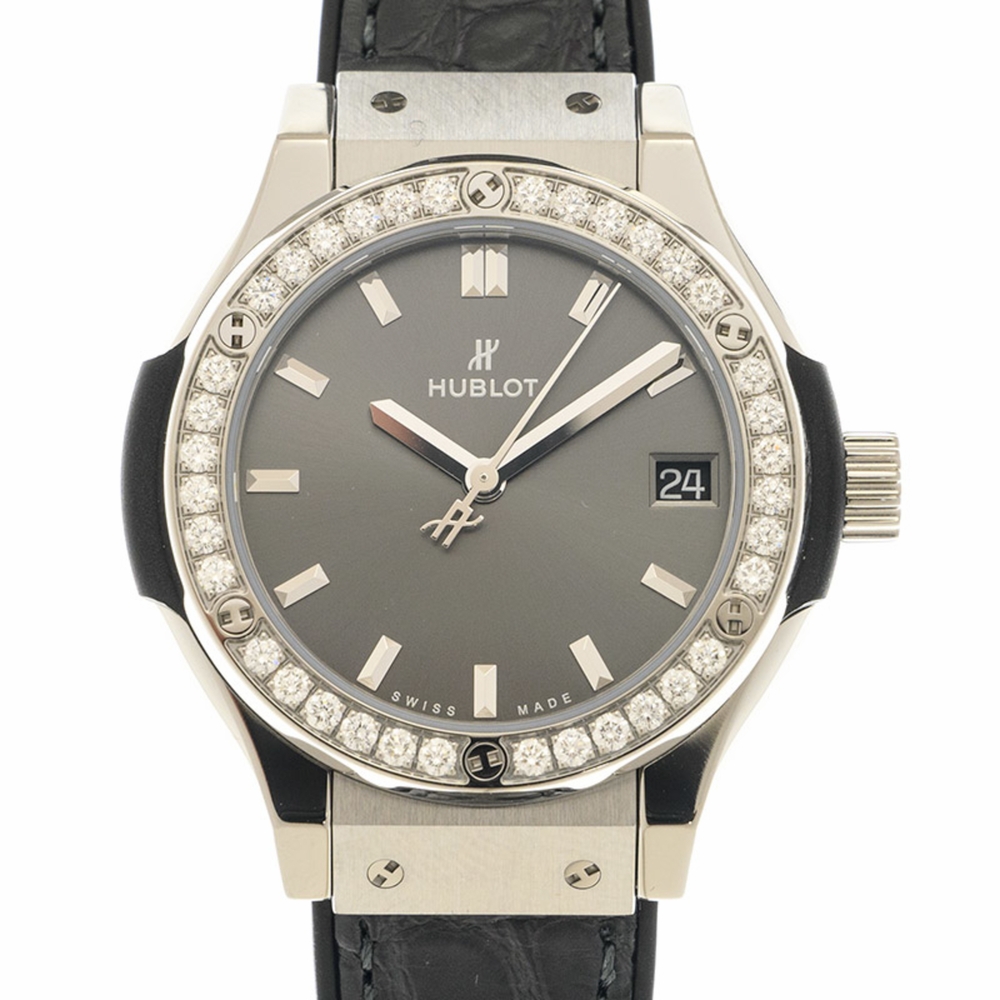 Titanium case with a grey and black alligator leather and rubber strap. Fixed bezel. Grey dial with silver-tone hands and index hour markers. Dial Type: Analog. Date display at the 3 o'clock position. Hublot Calibre HUB2912 quartz movement. Scratch resistant sapphire crystal. Pull / push crown. Solid case back. Round case shape, case size: 33 mm. Folding clasp. Water resistant at 50 meters / 150 feet. Functions: date, hour, minute, second. Additional Info: bezel set with 36 diamonds (0.75cts). Classic Fusion Series. Luxury watch style. Watch label: Swiss Made. Hublot Classic Fusion Quartz Grey Dial Ladies Watch 581.nx.7071.lr.1104.