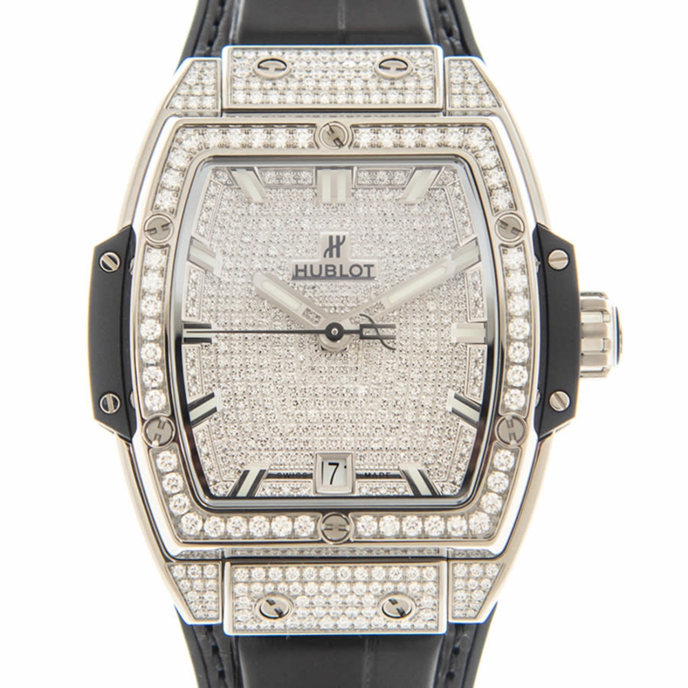 Titanium case with a black alligator/crocodile leather strap. Fixed titanium bezel. Diamonds dial with silver-tone hands and index hour markers. Dial Type: Analog. Date display at the 6 o'clock position. Hublot Calibre HUB1710 Automatic movement, based upon Zenith Elite 670, containing 27 Jewels, bitting at 28800 vph, and has a power reserve of approximately 50 hours. Scratch resistant sapphire crystal. Pull / push crown. Tonneau case shape, case size: 39 mm. Deployant clasp. Water resistant at 100 meters / 330 feet. Functions: date, hour, minute, second. Additional Info: bezel and case set with 206 diamonds, dial set with 406 diamonds (1.3 cts). Spirit Of Big Bang Series. Luxury watch style. Watch label: Swiss Made. Hublot Spirit Of Big Bang Automatic Ladies Watch 665.nx.9010.lr.1604.