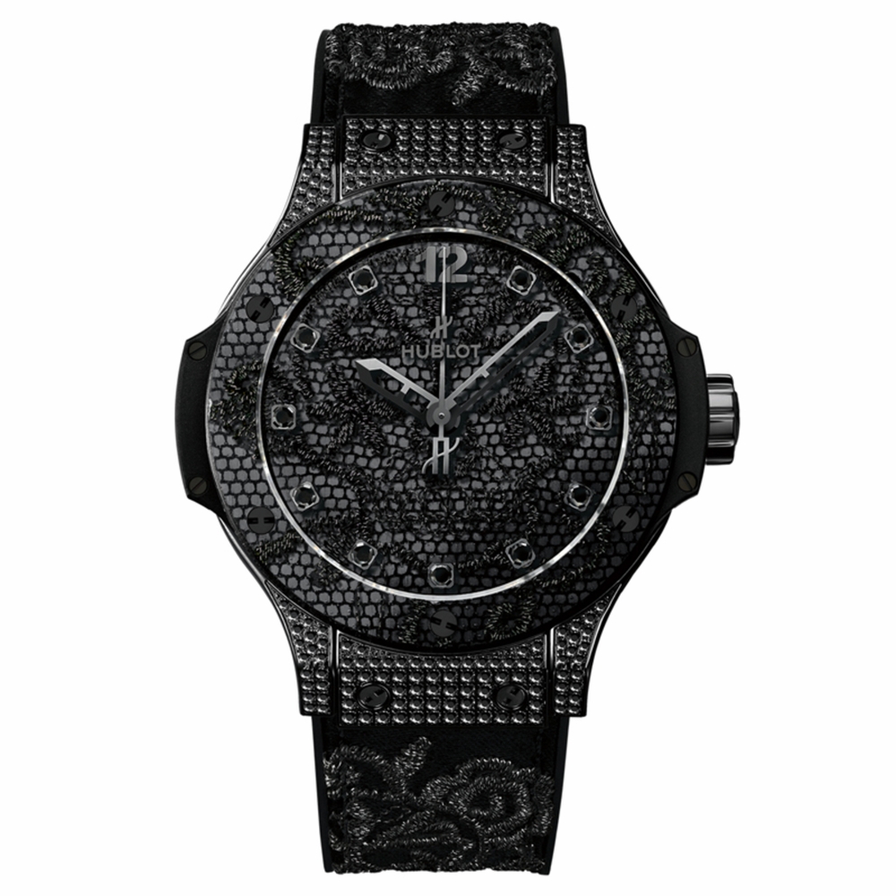 Polished black PVD stainless steel set with 198 black diamonds case with a black rubber & silk with black embroidery strap. Fixed - combination of carbon fiber and black embroidery bezel. Combination of carbon fiber & black embroidery dial with polished black plated hands and black diamond hour markers. Dial Type: Analog. Automatic movement. Hub1110 engine. Scratch resistant sapphire crystal. Skeleton transparent exhibition see through case back. Case diameter: 41 mm. Round case shape. Deployment clasp. Functions: hour, minute, second. Additional Info: limited edition - 200 pieces. Luxury watch style. Watch label: Swiss Made. Item Variations: 343 SV 6510 NR 0800, 343-SV-6510-NR-0800, 343/SV/6510/NR/0800, 343SV6510NR0800. Hublot Big Bang Broderie Stainless Steel Black Diamond Set Limited Edition Ladies Watch 343.SV.6510.NR.0800.