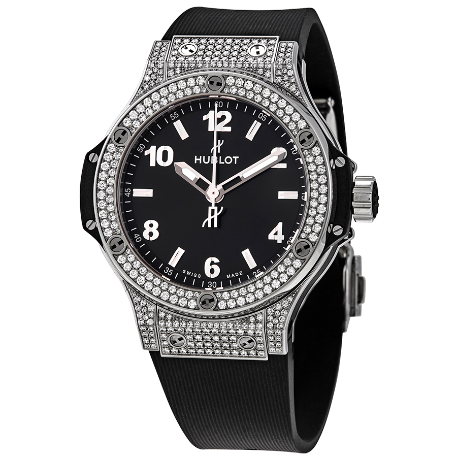 Stainless steel case set with diamonds case with a black rubber strap. Fixed bezel set with diamonds bezel. Black dial with luminous hands and alternating Arabic and index hour markers. Minute markers around the outer rim. Dial Type: Analog. Quartz movement. Scratch resistant sapphire crystal. Case diameter: 38 mm. Round case shape. Push button deployment clasp. Water resistant at 100 meters / 330 feet. Functions: hour, minute, second. Luxury watch style. Watch label: Swiss Made. Hublot Big Bang Black Dial Black Rubber Ladies Watch 361.SX.1270.RX.1704.