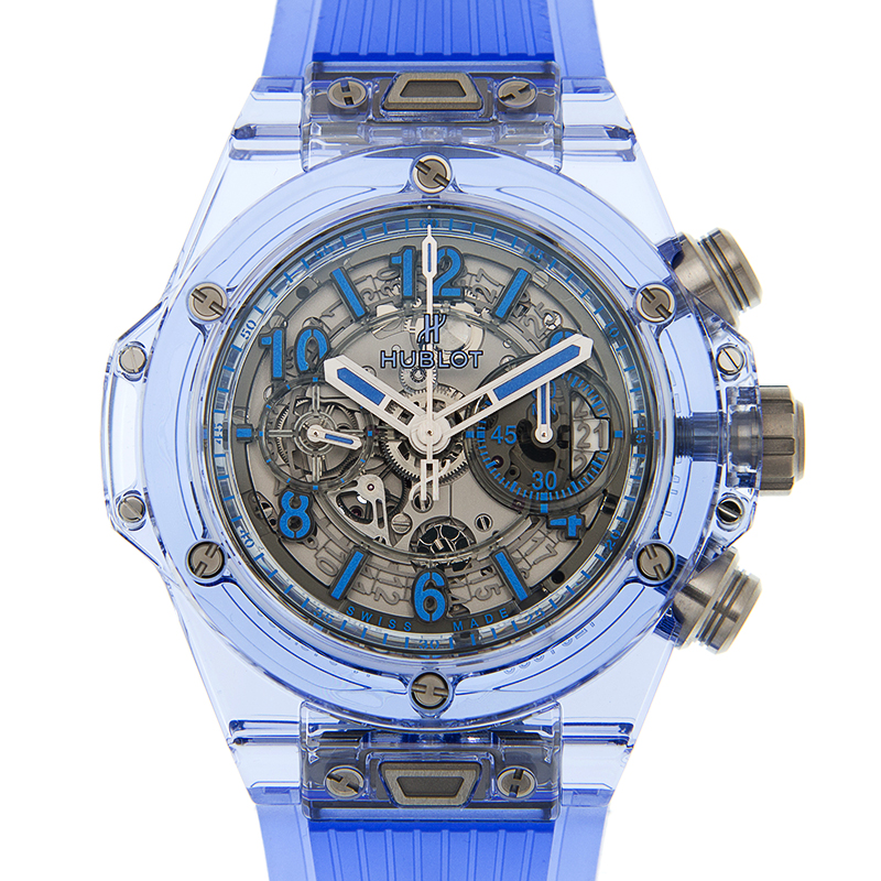 Blue sapphire crystal case with a blue rubber strap. Fixed blue bezel. Skeleton blue dial with blue hands and index hour markers. Minute markers around the outer rim. Dial Type: Analog. Luminescent hands and markers. Date display at the 3 o'clock position. Chronograph - two sub-dials displaying: 60 second and 60 minute. Hublot Calibre HUB1242 automatic movement with a 72-hour power reserve. Scratch resistant sapphire crystal. Screw down crown. Transparent case back. Case size: 45 mm. Round case shape. Water resistant at 100 meters / 330 feet. Functions: chronograph, column wheel, flyback, date, hour, minute, second. Luxury watch style. Watch label: Swiss Made. Hublot Big Bang Unico Chronograph Automatic Mens Watch 411.JL.4809.RT.