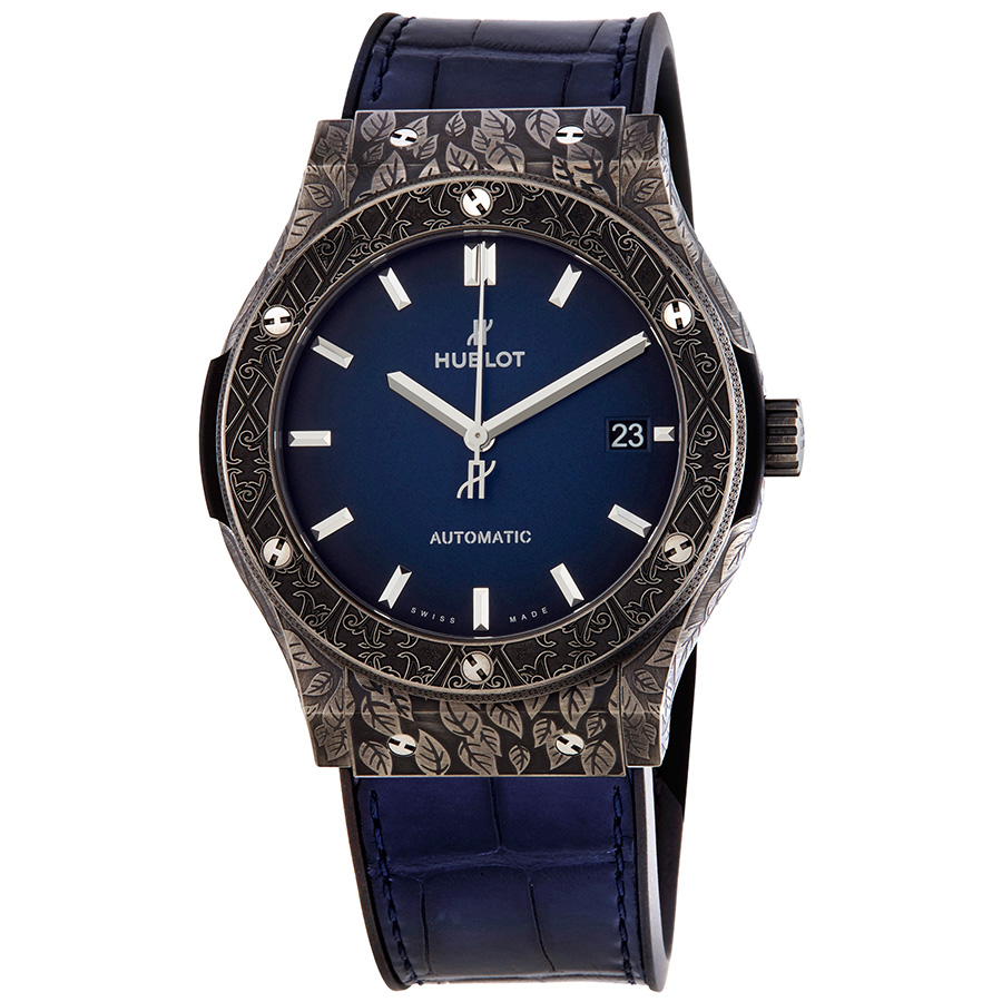 Brushed titanium case with a blue vintage alligator leather with rubber interior strap. Fixed bezel. Blue dial with silver-tone hands and index hour markers. Dial Type: Analog. Date display at the 3 o'clock position. Hublot Calibre HUB1112 automatic movement with a 42-hour power reserve. Scratch resistant sapphire crystal. Round case shape. Case size: 45 mm. Water resistant at 50 meters / 165 feet. Functions: date, hour, minute, second. Additional Info: limited to 100 pieces. Luxury watch style. Watch label: Swiss Made. Hublot Classic Fusion Automatic Blue Dial Mens Limited Edition Watch 511.NX.6670.LR.OPX17.