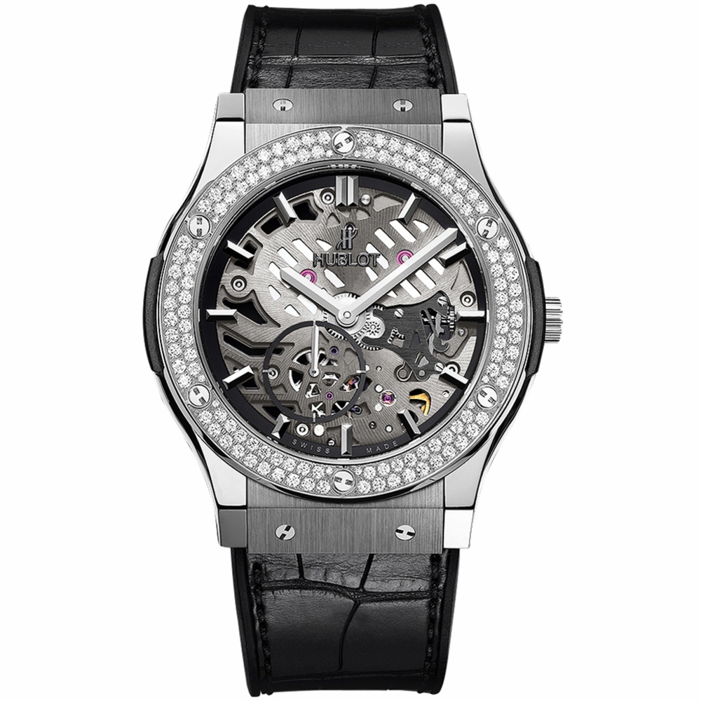 Grey titanium case with a black alligator outer / rubber inner strap. Fixed grey bezel with diamond set. Skeleton dial with silver-tone hands and index hour markers. Dial Type: Analog. One subdial displaying: small second. Hublot Calibre HUB1300.4 Hand Wind movement, containing 23 Jewels, composed of 123 parts, bitting at 21600 vph, and has a power reserve of approximately 90 hours. Scratch resistant sapphire crystal. Pull / push crown. Skeleton transparent exhibition see through case back. Round case shape, case size: 45 mm. Water resistant at 50 meters / 165 feet. Functions: hour, minute, second. Additional Info: bezel set with 126 brillants (1.41cts). Classic Fusion Classico Ultra Thin Series. Luxury watch style. Watch label: Swiss Made. Item Variations: 515 NX 0170 LR 1104, 515-NX-0170-LR-1104, 515/NX/0170/LR/1104, 515NX0170LR1104. Hublot Classic Fusion Classico Ultra Thin Skeleton Dial Hand Wind Mens Watch 515.NX.0170.LR.1104.