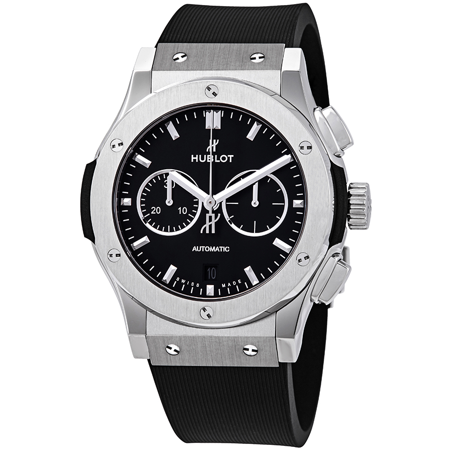 Grey titanium case with a black rubber strap. Fixed grey titanium bezel. Black dial with silver-tone hands and index hour markers. Minute markers around the outer rim. Dial Type: Analog. Date display at the 6 o'clock position. Chronograph - two sub-dials displaying: 60 second and 30 minute. Hublot calibre HUB1143 automatic movement, based upon ETA 2892-A2, containing 59 Jewels, bitting at 28800 vph, and has a power reserve of approximately 42 hours. Scratch resistant sapphire crystal. Transparent case back. Round case shape. C ase size: 42 mm. Deployment clasp with a push button release. Water resistant at 50 meters / 165 feet. Functions: chronograph, date, hour, minute, second. Classic Fusion Series. Luxury watch style. Watch label: Swiss Made. Hublot Classic Fusion Chronograph Automatic Black Dial Mens Watch 541.NX.1171.RX.