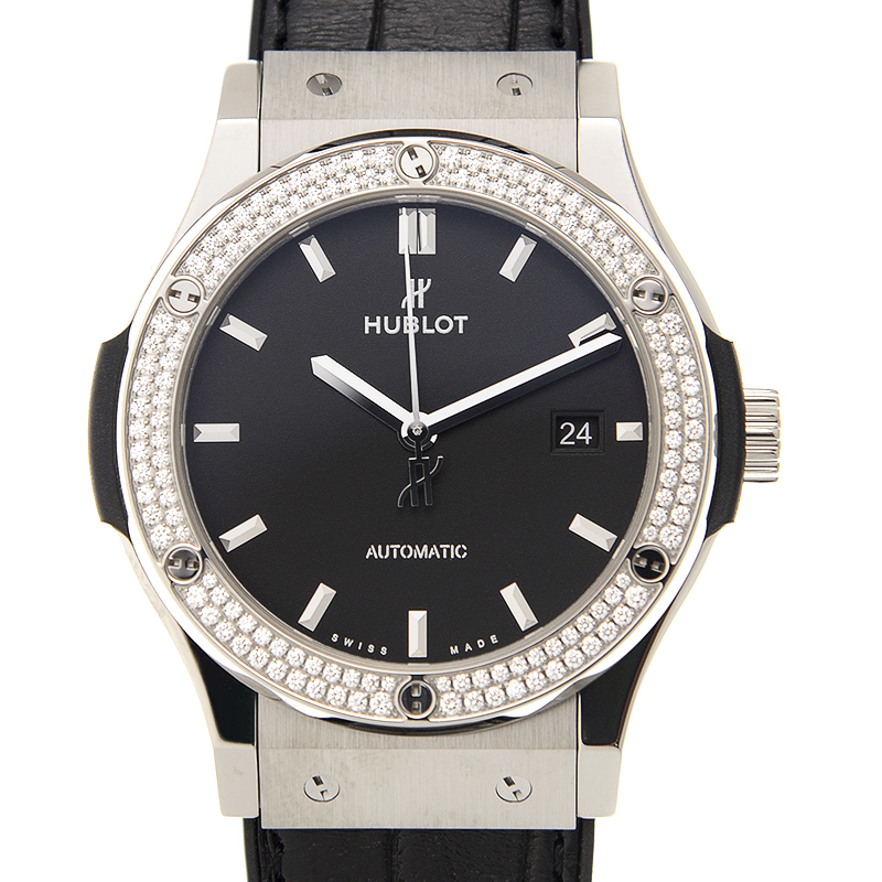 Grey titanium case with a black alligator outer / rubber inner strap. Fixed diamond set bezel. Mat black dial with rhodium plated hands and index hour markers. Dial Type: Analog. Date display at the 3 o'clock position. Hublot Calibre HUB1110 Automatic movement, based upon Sellita SW300-1, containing 21 Jewels, bitting at 28800 vph, and has a power reserve of approximately 42 hours. Scratch resistant sapphire crystal. Pull / push crown. Skeleton transparent exhibition see through case back. Round case shape. Case size: 42 mm. Fold over with safety release clasp. Water resistant at 50 meters / 165 feet. Functions: date, hour, minute, second. Additional Info: bezel set with 138 brilliant cut diamonds weighing a total of approx 0.89 carats. Luxury watch style. Watch label: Swiss Made. Hublot Classic Fusion Mat Black Dial Automatic Mens Diamond Watch 542.NX.1171.LR.1104.